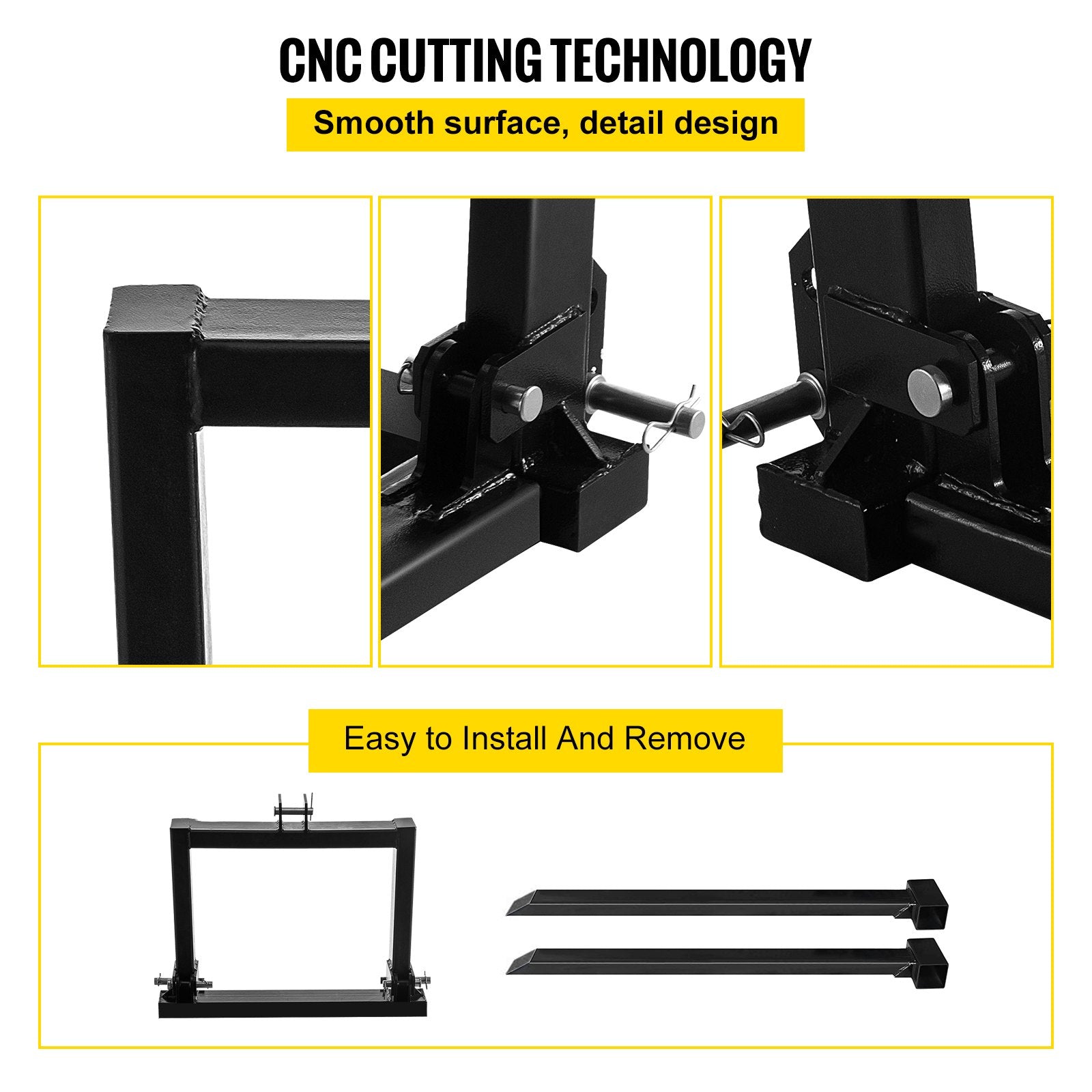 - 【BEVEL DESIGN & CNC CUTTING】- With the bevel design, this tractor pallet fork attachment has a proper angle to fork cargo. CNC cutting technology makes sure that the whole pallet fork is entirely dealt with.