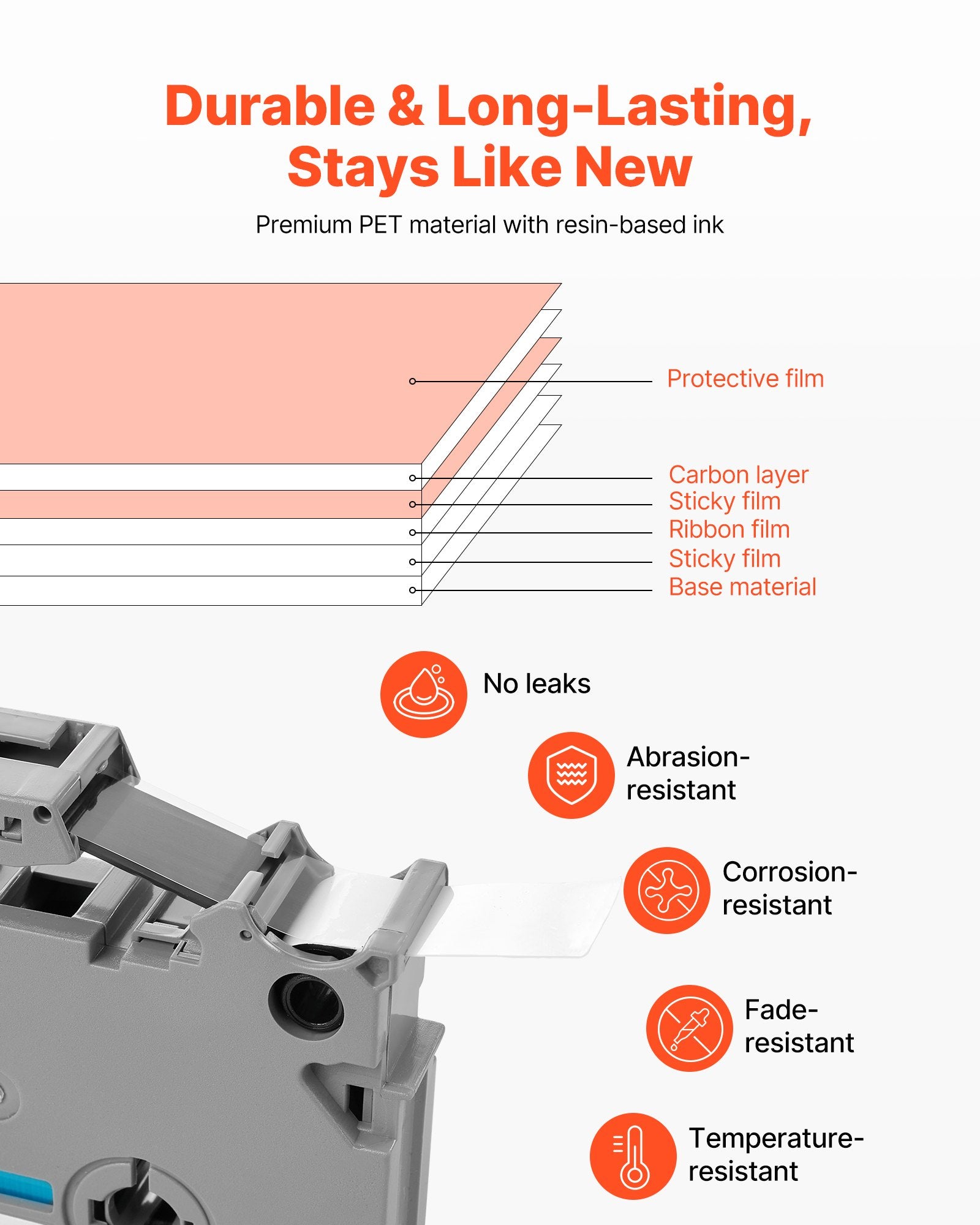 - Long-lasting & Durable: Built to last! Made with high-quality PET material and resin-based ink, this label tape is waterproof, scratch-resistant, and fade-proof. It’s tough enough to handle daily wear while keeping your labels looking fresh