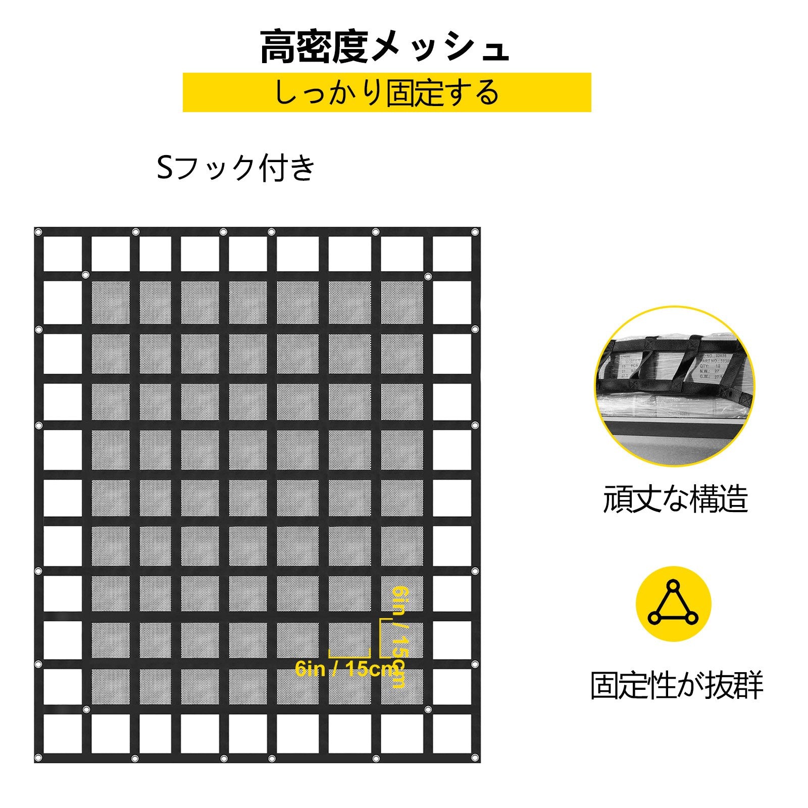- Durable Polyester & 8×6.7 Feet: Square Hole Size: 6×6 inch/15×15 cm, Net Size: 8×6.7 ft/244×205 cm. The cargo net for pickup truck bed adopts high-strength polyester and iron hardware with the zinc plate.