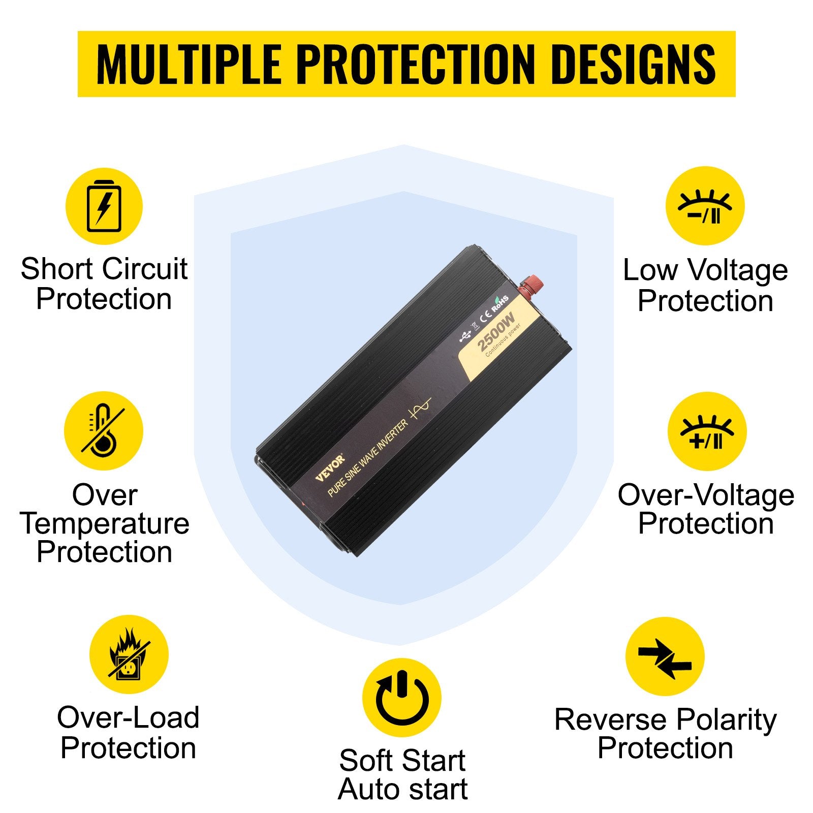 - Comprehensive Security Features: Incorporating multiple intelligent security protections, this pure sine wave inverter ensures stable and safe operation of connected electrical appliances. It includes safeguards against overvoltage, undervoltage, overtemperature, short circuit, and overload.