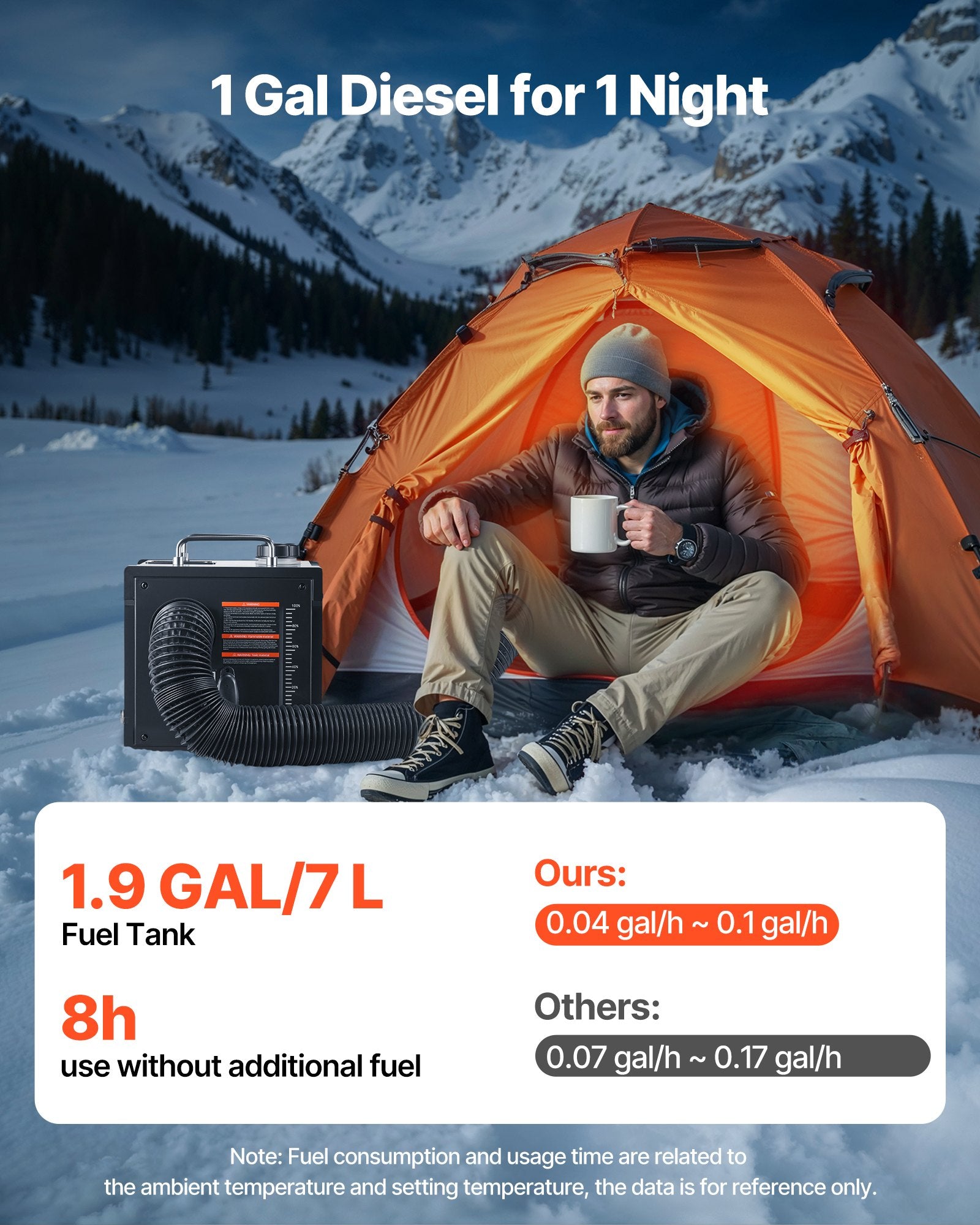 - Fuel Efficient: This portable diesel heater features a quiet, energy-saving fuel pump and burns 0.04–0.1 gal/h with over 90% efficiency. The 1.9 gal fuel tank supports all-night heating without refueling, reducing fuel use and energy waste