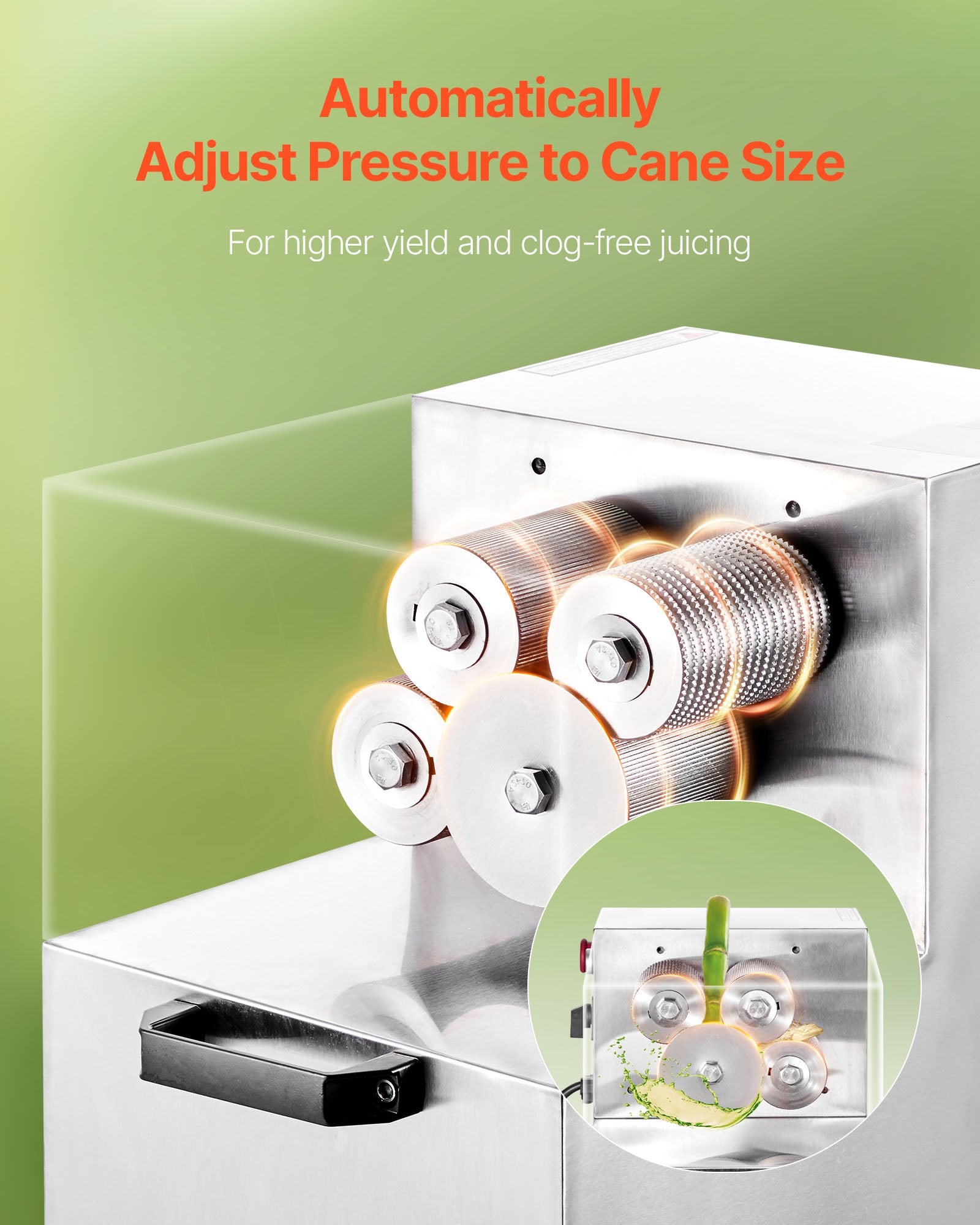 - Auto-Adjusting Roller Gap: This commercial sugar cane juicer automatically adjusts the roller gap to fit cane thickness, preventing clogs and maximizing juice yield. Enjoy smooth, efficient extraction—no matter the stalk size