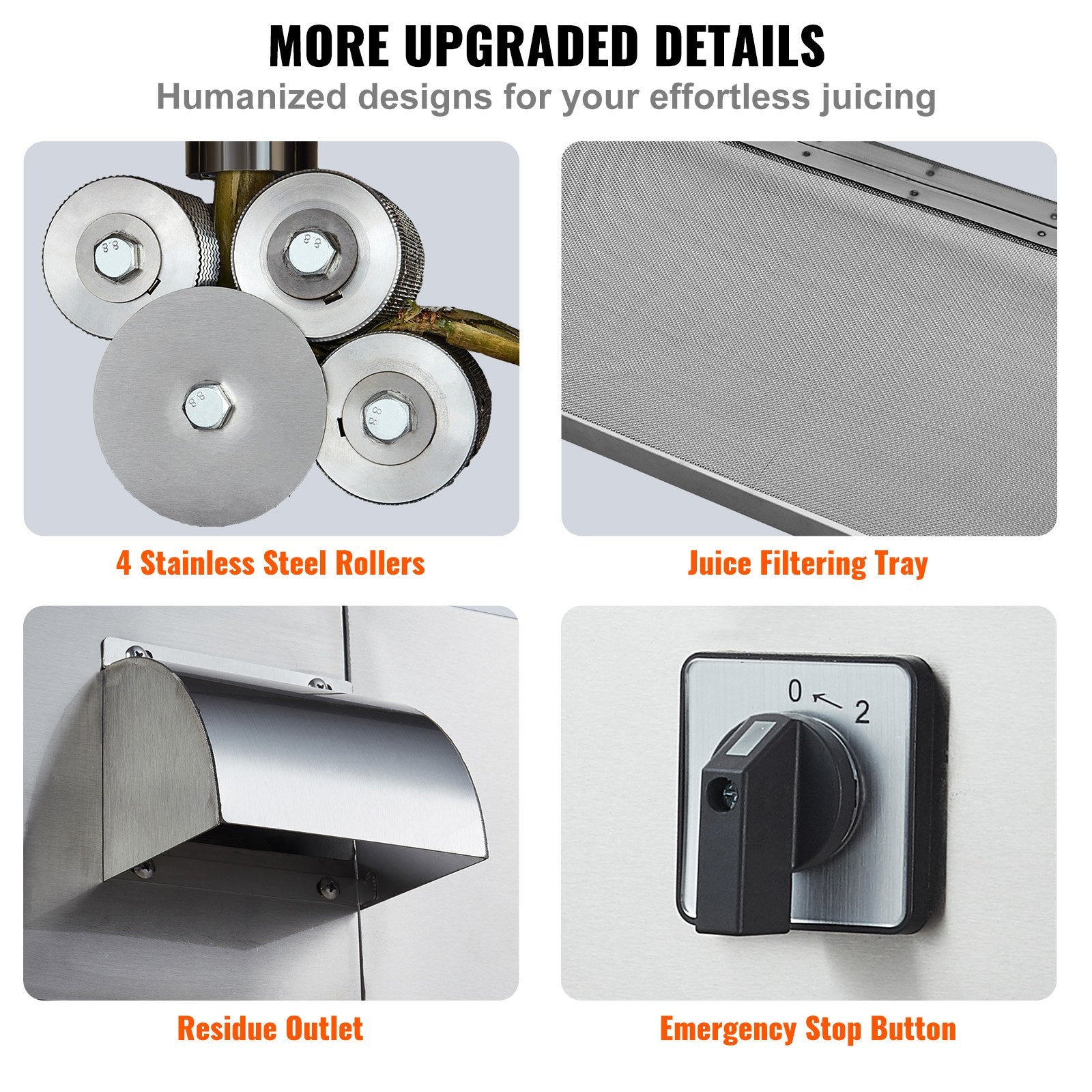 - Efficient Juicing Productivity: VEVOR electric sugar cane juicer is equipped with 800W powerful motor, along with 4 solid stainless steel rollers, making sugarcane juicing more effortless and efficient. 661LBS/H high productivity maximizes juice output and efficiency.