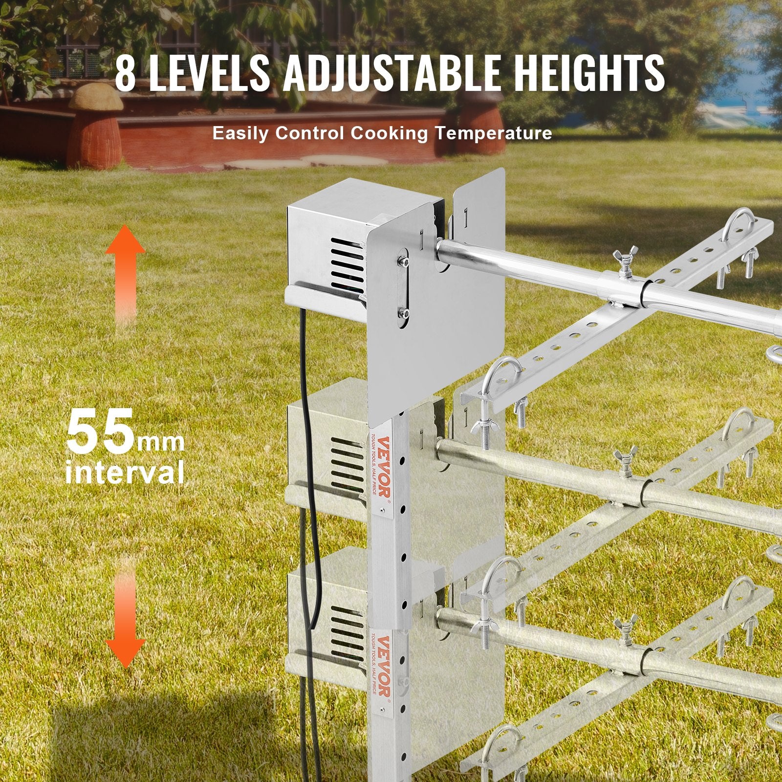 - Adjustable Heights: Designed with 8 different height holes, the grill rotisserie system can be easily adjusted. The bbq rotisserie grill kit is designed to control cooking temperature. The upgraded 45-degree tripod ensures stability even on grass.