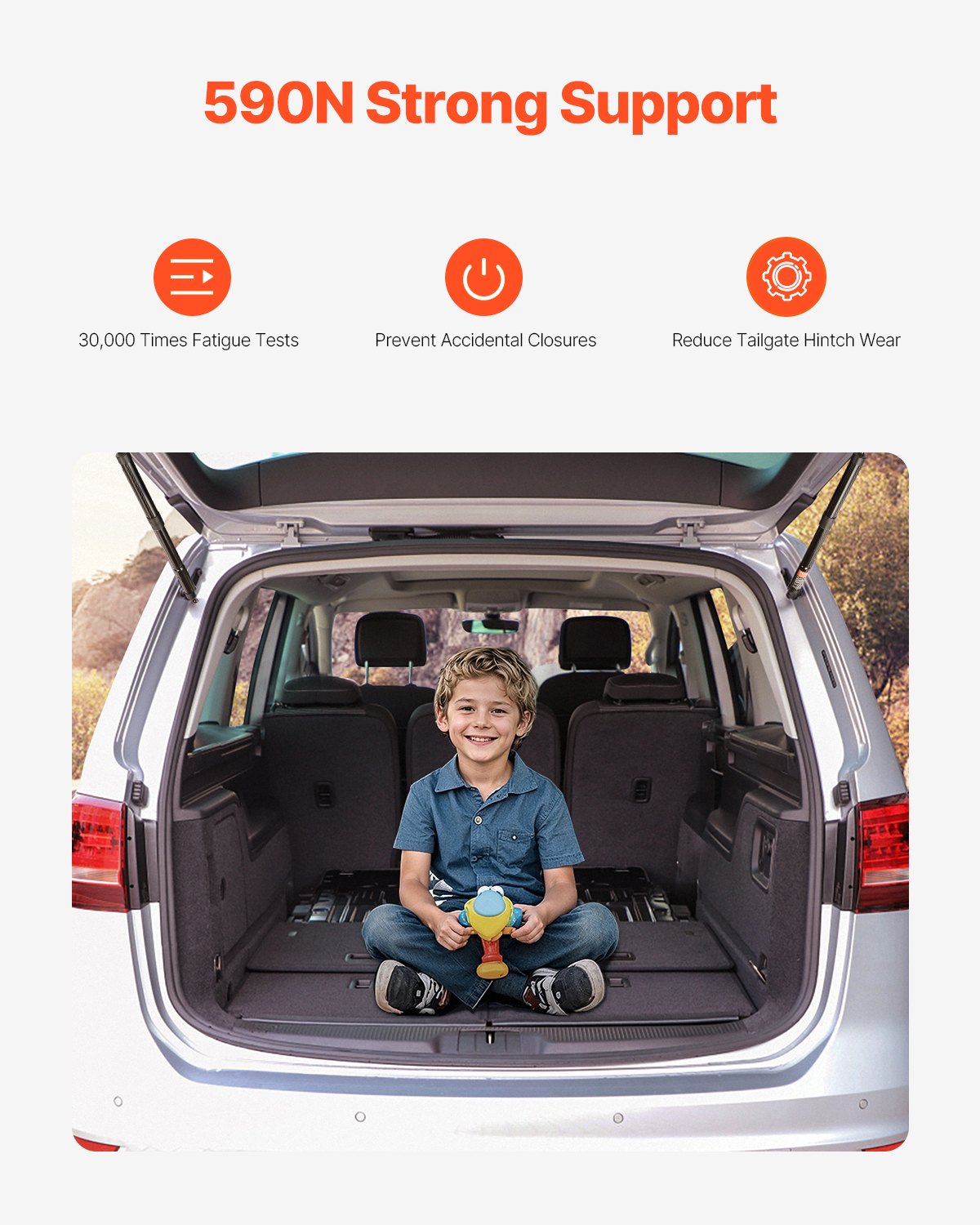 - Strong Support: With a powerful 590N support force, our rear tailgate power lift support shock struts open and close your tailgate smoothly and securely within 5-8 seconds, reducing wear on hinges, and the rear hatch liftgate strut has passed 30,000 fatigue tests for enhanced safety.