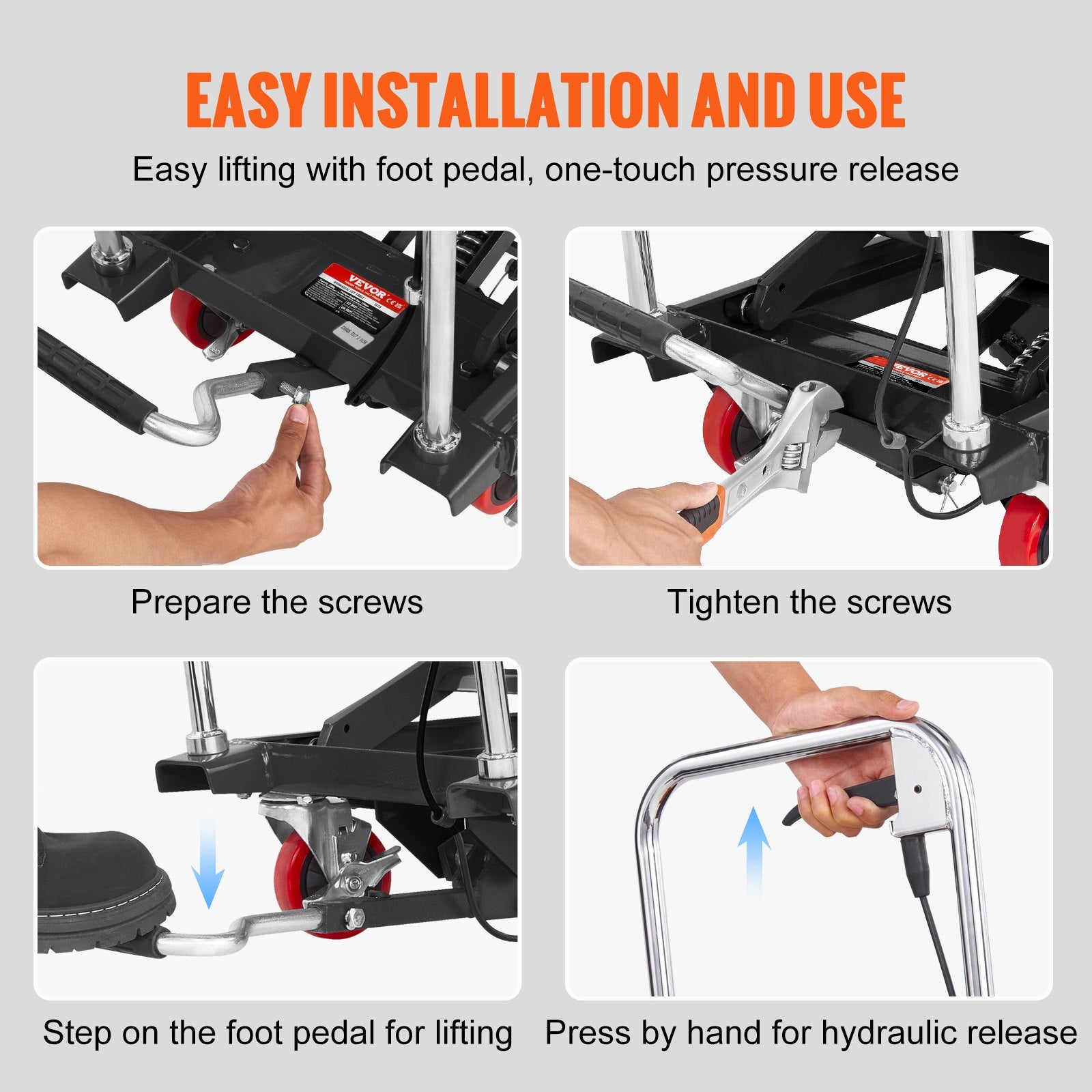 - Premium Hydraulic Pump: Experience impressive lift heights up to 28.5 inches with VEVOR hydraulic lift table cart. Our high-quality integrated hydraulic pump ensures efficient and reliable lifting without any oil leakage issues. Get the power you need for smooth and controlled lifting performance.