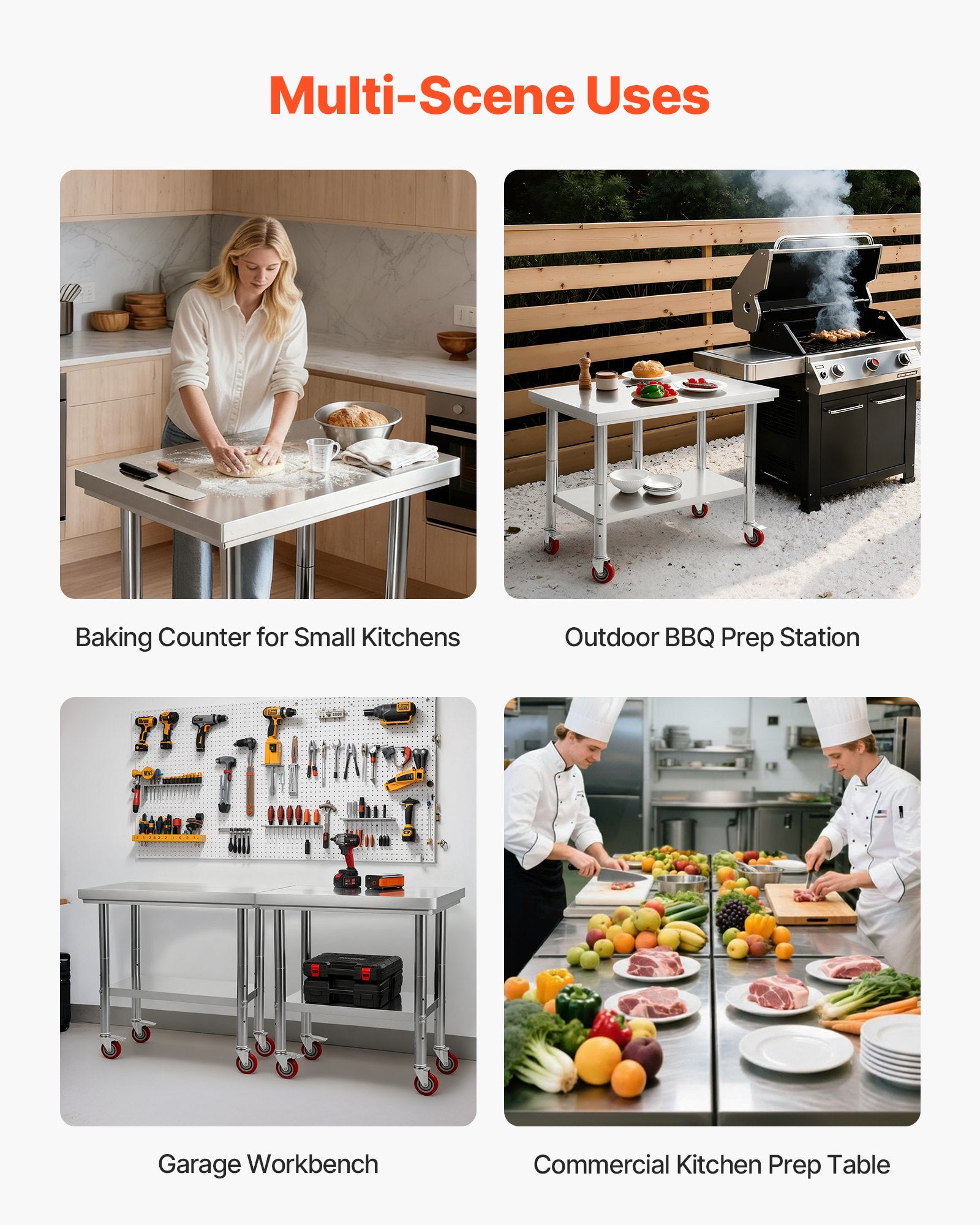 - Practical Sizes: Available in multiple sizes to fit your space. Our stainless steel table is ideal for kitchens, garages, or home renovations. Measure your area before purchase for a seamless fit