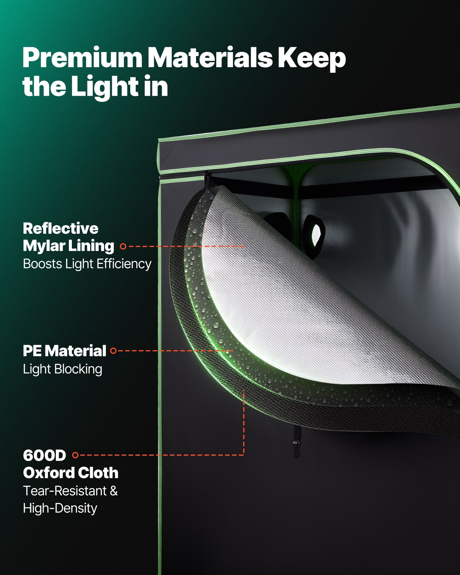 - 100% Reflective Interior: The interior features polyester film that maximizes light reflection and minimizes heat loss, promoting healthier plant growth. The exterior is made from durable 600D Oxford fabric that is tear-resistant and light-blocking. Zippers with double black lining effectively seal gaps