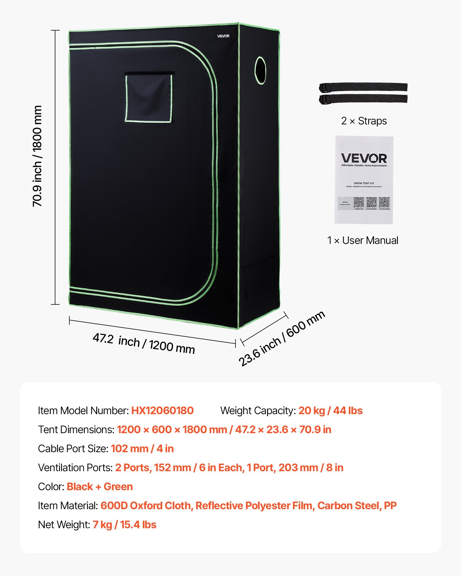 - Tent Dimensions: 1200 x 600 x 1800 mm / 47.2 x 23.6 x 70.9 in