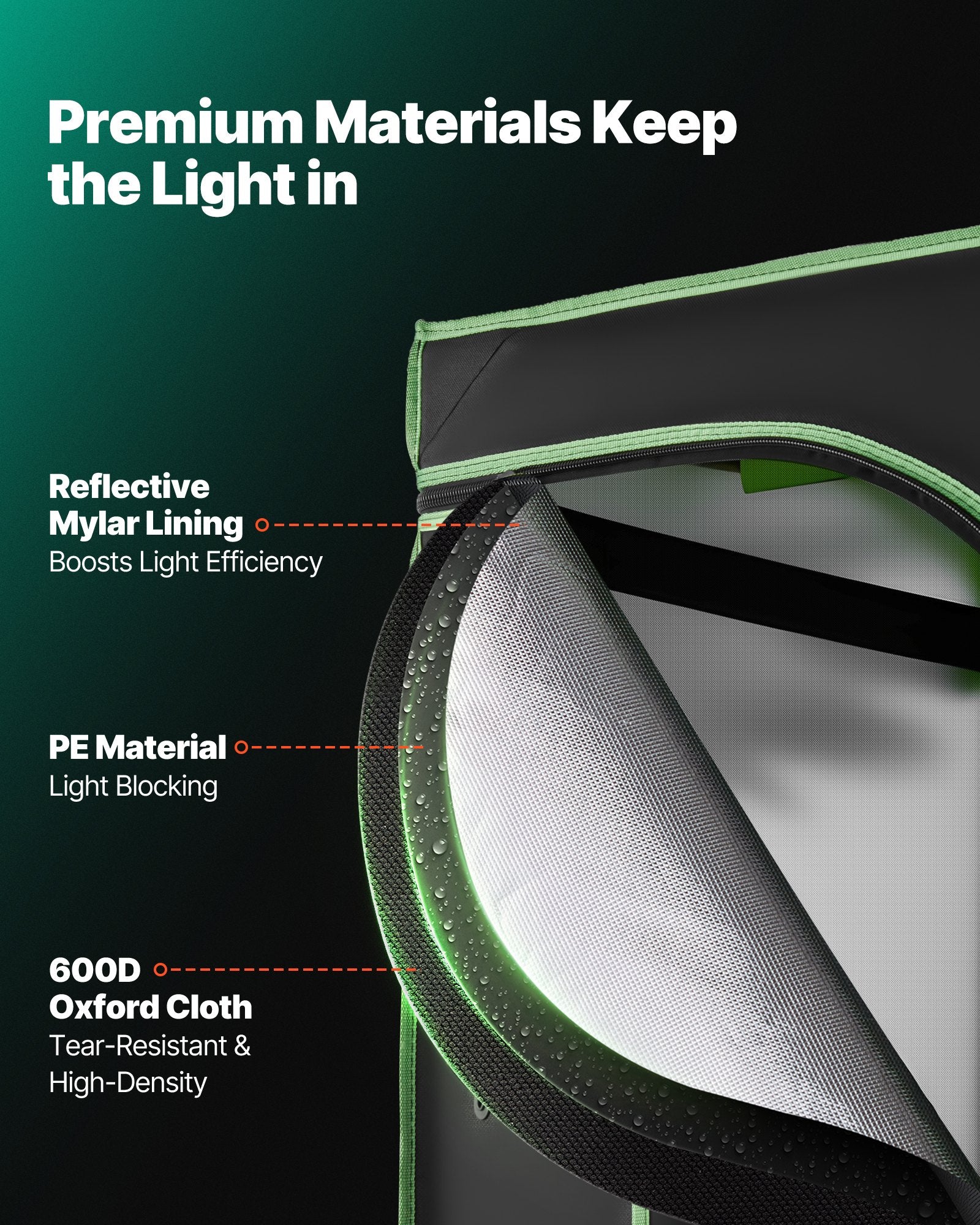 - 100% Reflective Interior: The interior features polyester film that maximizes light reflection and minimizes heat loss, promoting healthier plant growth. The exterior is made from durable 600D Oxford fabric that is tear-resistant and light-blocking. Zippers with double black lining effectively seal gaps