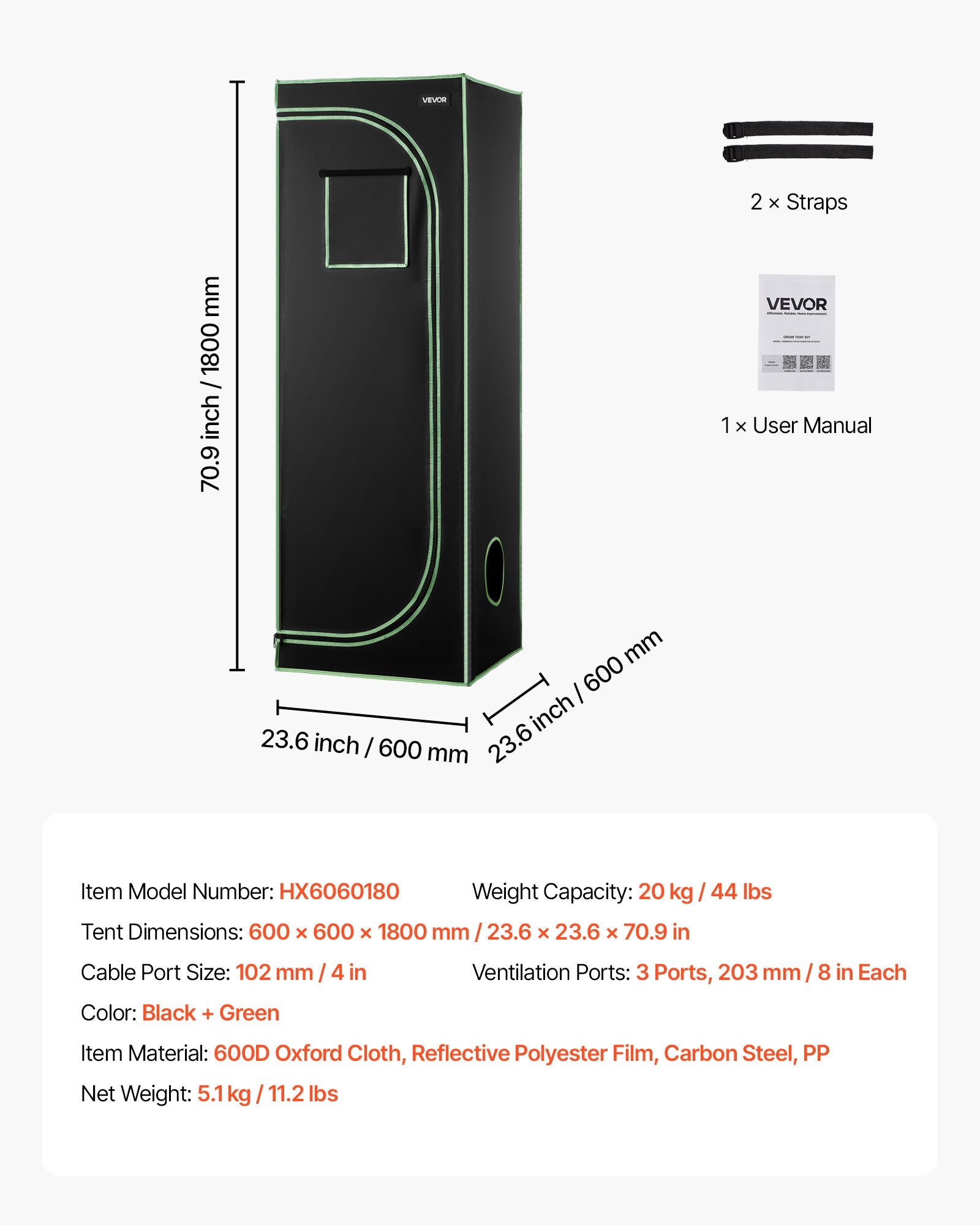 - Tent Dimensions: 600 x 600 x 1800 mm / 23.6 x 23.6 x 70.9 in