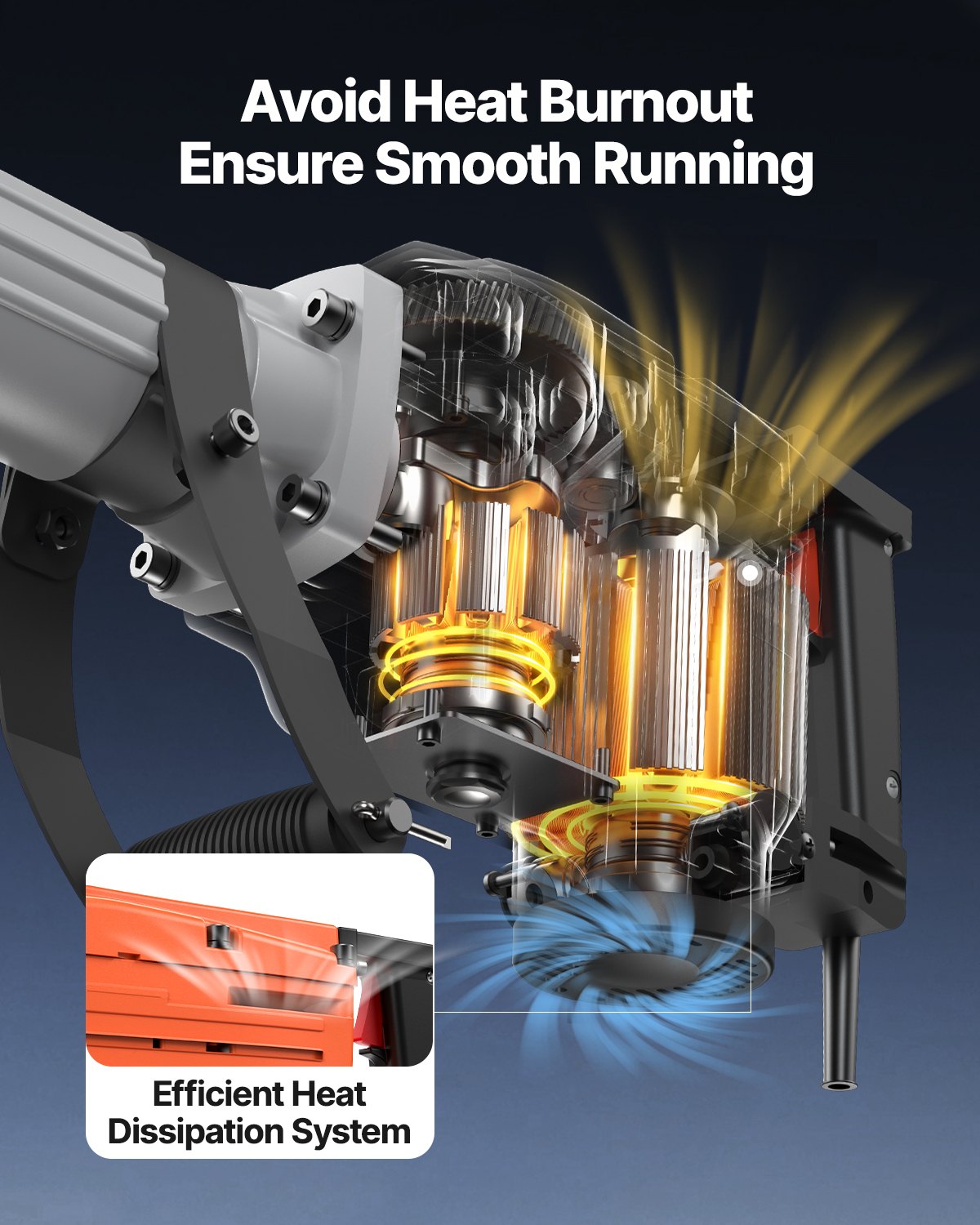 - Stays Cool During Intense Work: The efficient cooling system effectively cools the motor to improve the concrete breaker's life. The engine will be at low temperatures even after a long working time.