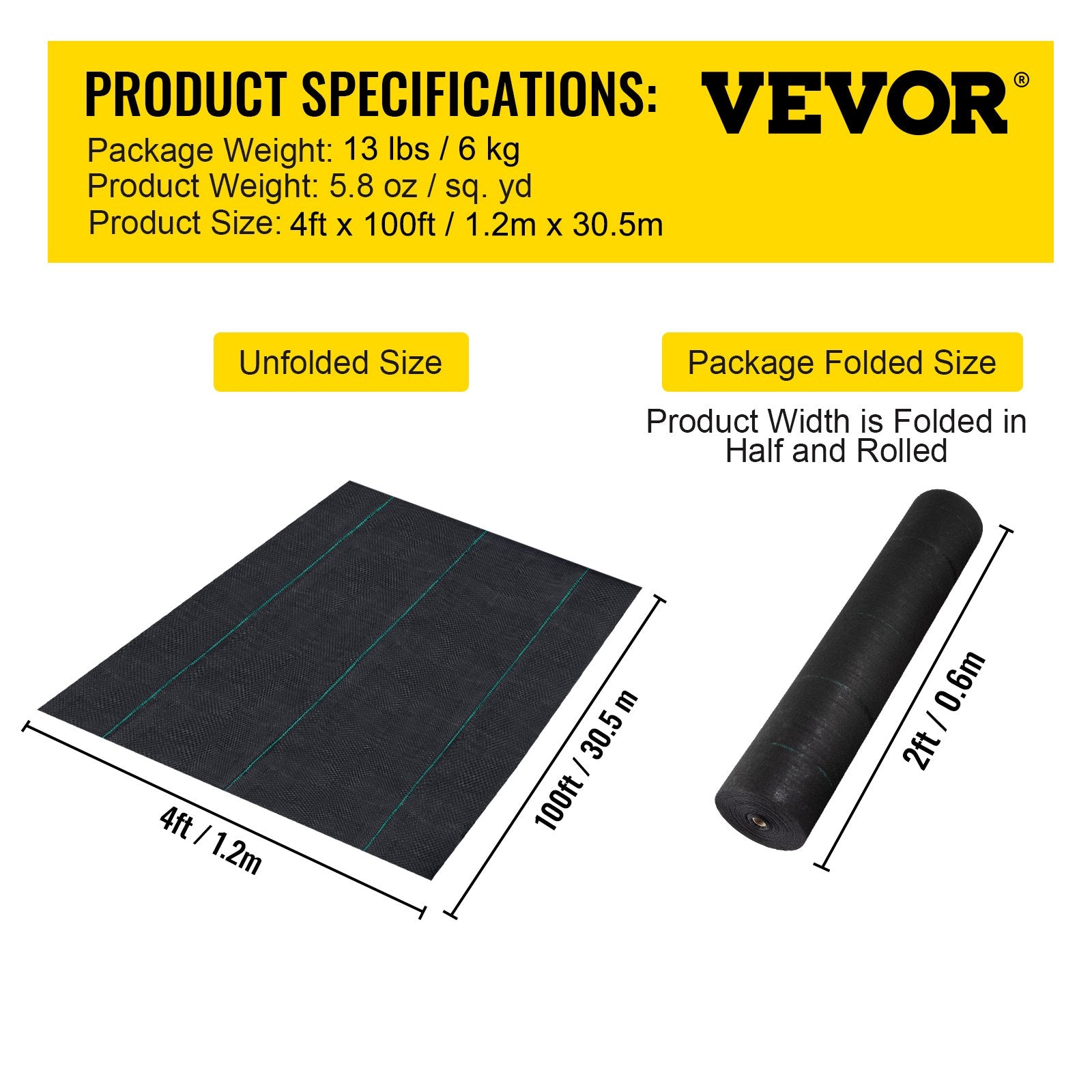 - Heavy Duty Weed Barrier Fabric: Crafted from 5.8 OZ high-density, tear and corrosion resistant woven fabric. VEVOR 4 x 100FT woven weed barrier landscape fabric is the preferred choice for agriculture and industry. It ensures superior weed prevention and promotes soil health, keeping your landscaping remain weed-free for an extended period.
