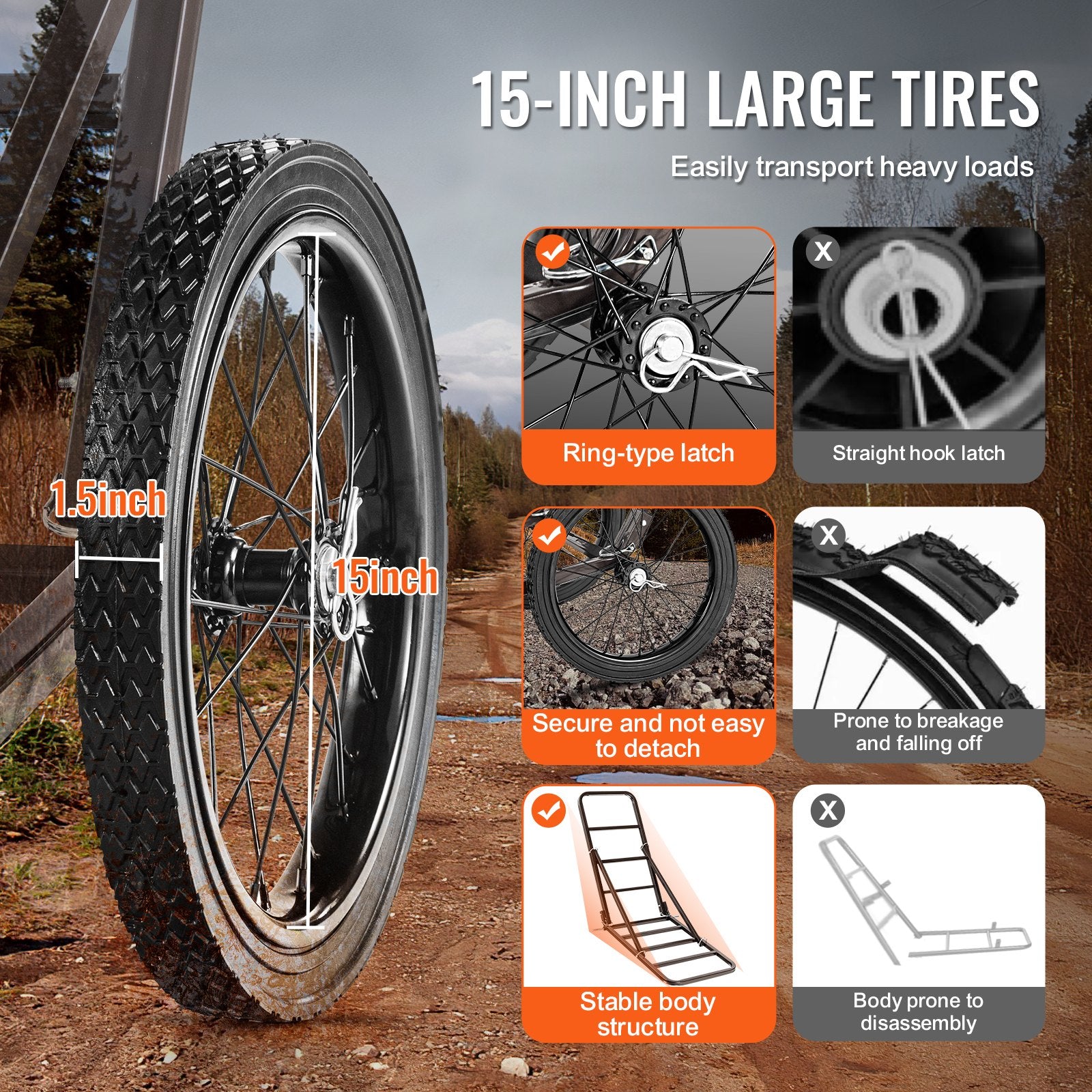 - Solid Rubber Tires: Unlike inflatable tires, this folding game cart uses 15-inch solid rubber tires, avoiding the risk of punctures and air leaks, and offering resistance to various terrains. With a larger tire diameter, transportation becomes easier and more flexible. Additionally, the tire's hitch pin features a ring-lock design, providing better security compared to conventional straight hook connections, ensuring the stability of the cart and preventing disassembly.