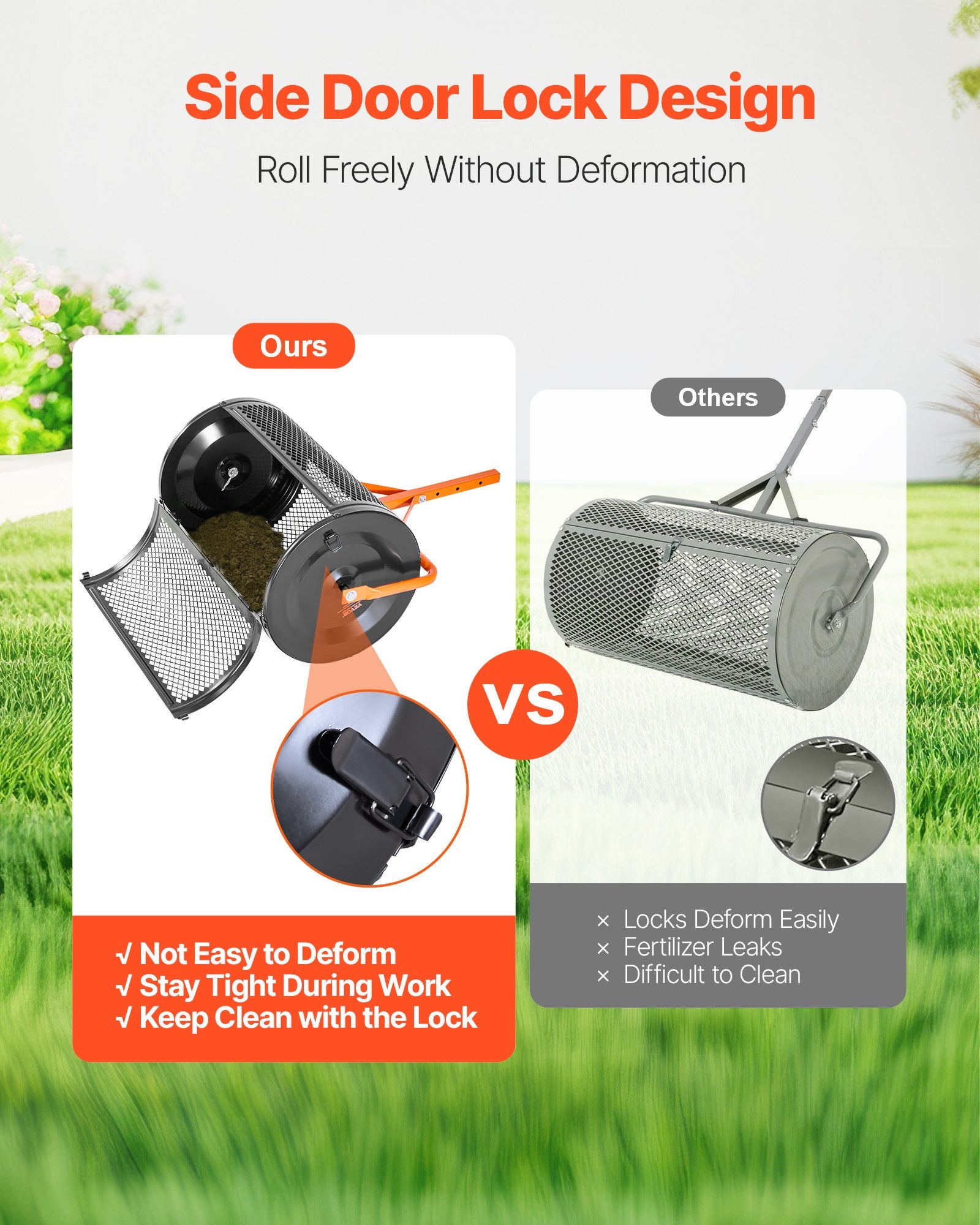 - Large Capacity Drum: The 24-inch peat moss roller holds up to 2.66 cubic feet of material, reducing the need for frequent refills. Load it once with grass seed, compost, or soil conditioner to cover large areas quickly and easily.