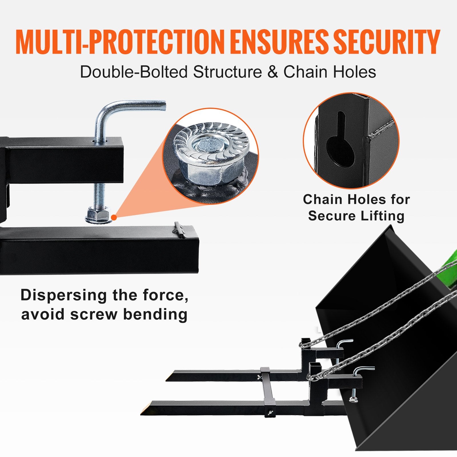- Easy Installation & Versatile: Our tractor fork is designed to handle a variety of tasks. Simply slide the fork over the cutting edge of your bucket and clamp it down to lock it in place. You can use it to move logs, wood, and firewood, transport fence posts and hay bales, clear debris and bushes, and more.