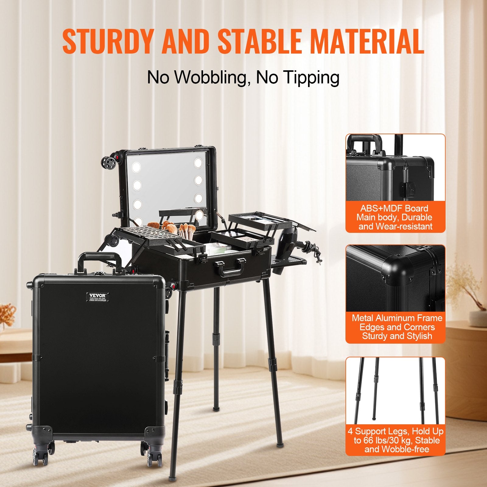 - Sturdy and Durable: The main body of the makeup case is made of ABS+MDF board, which is high-hardness and wear-resistant. The frame and corner connections are made of metal aluminum material, ensuring sturdiness and durability. The 4 support legs are strong and stable, capable of holding up to 66 pounds/30 kilograms without easily shaking or tipping over.