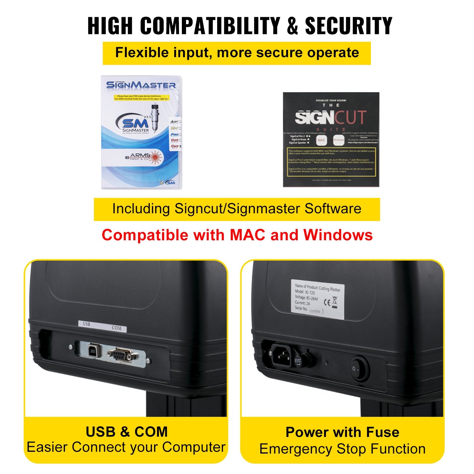 - High Compatibility & Security: This plotter cutter vinyl includes the signcut and signmaster software that works with MAC and Windows via USB or serial port. It also supports other software such as graph-cut and flexi. There is power with fuse possesses of emergency stop function to prevent you from the danger.