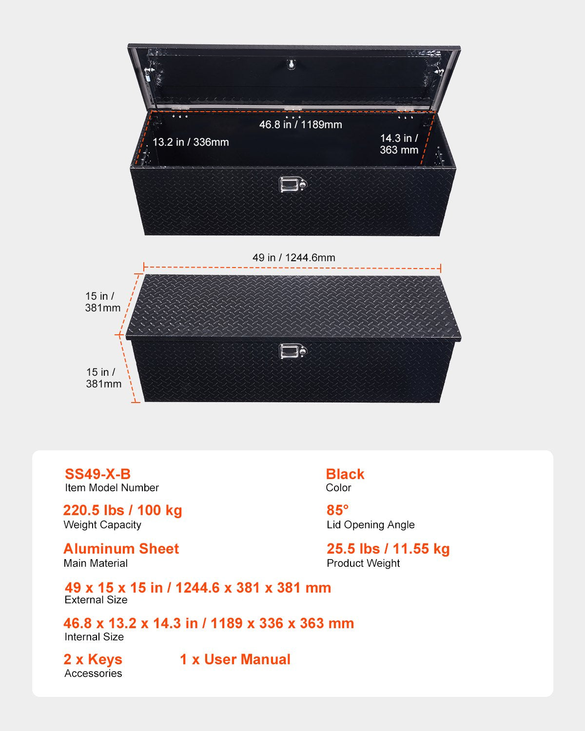 Heavy Duty Aluminum Truck Bed Tool Box, Diamond Plate Tool Box with Side Handle and Lock Keys, Storage Toolbox Chest Organizer for Trailer, Pickup, RV, 49"x15"x15"(1244.6x381x381mm), Black