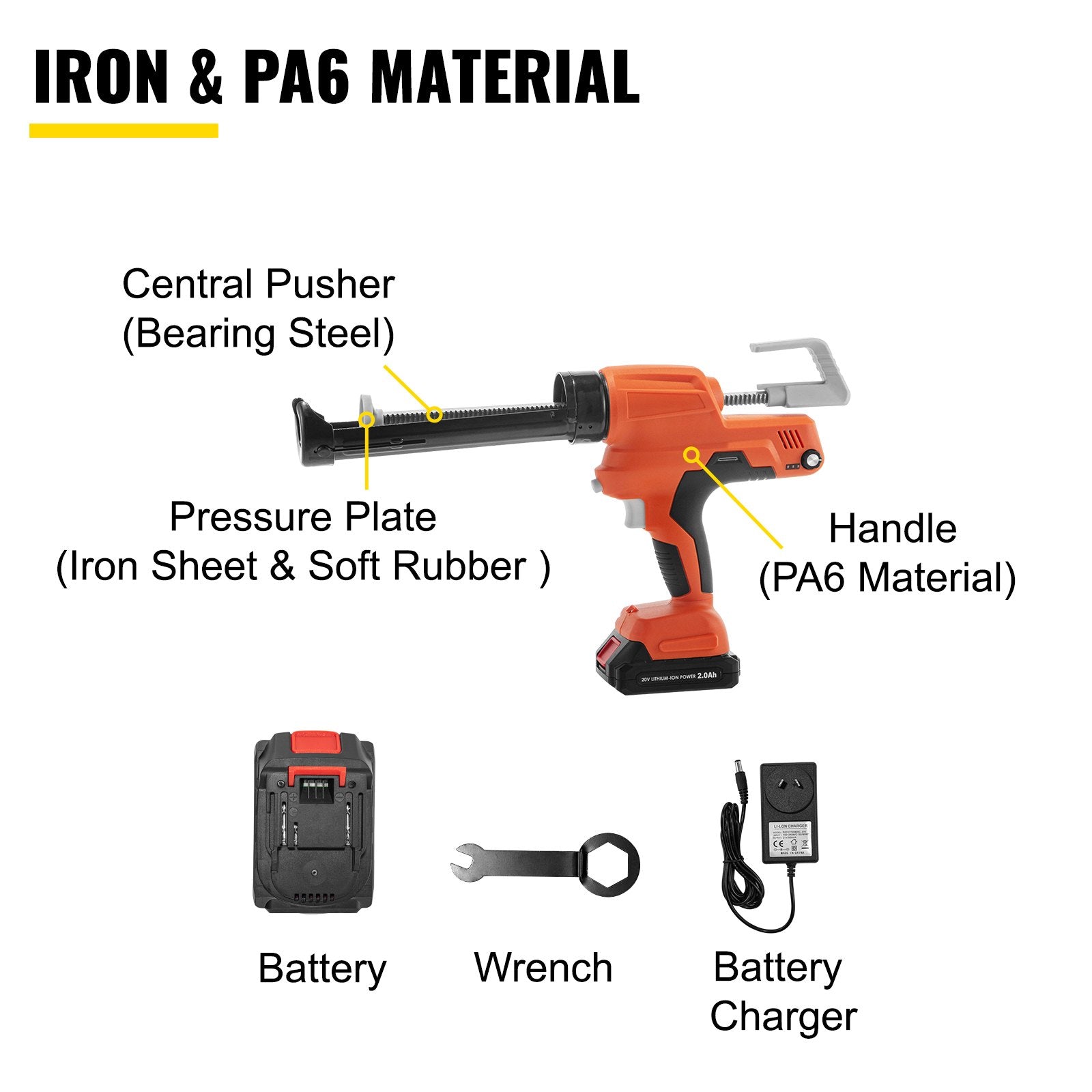 - Premium Quality: Made of premium iron, the barrel of the sausage caulking gun is light-weight, durable, stable, and can be used for a long time. The shell of the electric caulking gun is constructed of PA6 material, which has the advantage of smooth surface, well toughness, and wear-resistance. Here, we will provide you one wrench, one hard rubber, one battery.