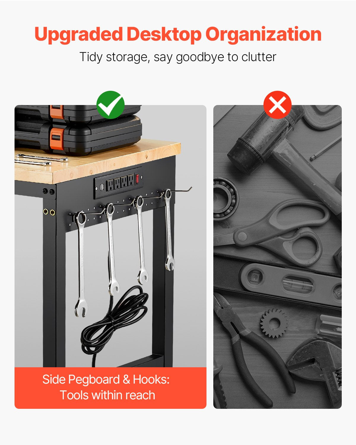- Organize in Style: Side panels and hooks of the work bench table let you hang and organize tools, keeping your space tidy while boosting efficiency. Customize the side panel to fit your storage needs—great for any project, big or small!