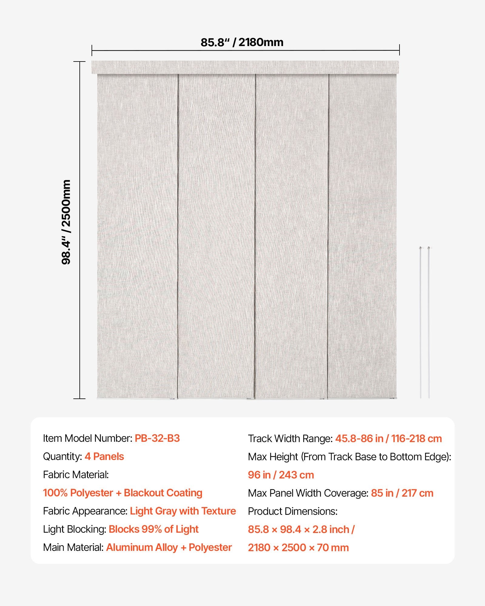 Panel Track Blinds, Extendable Track from 116 cm to 218 cm W, Trimmable Panel Curtains Up to 243cm H, Vertical Blackout Panel Blinds for Sliding Doors, Patio Doors, Room Divider, Light Gray
