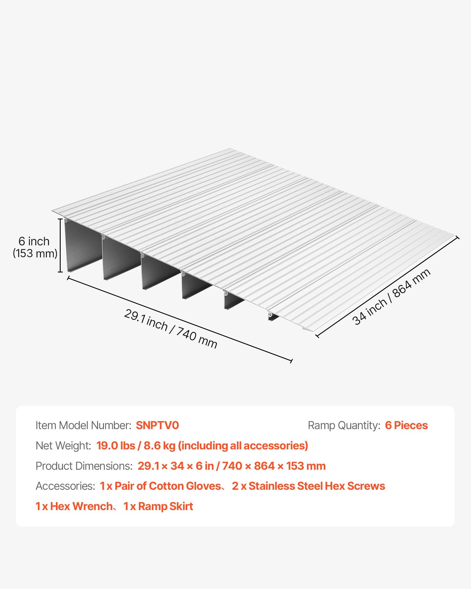 - Easy Access: This threshold ramp (31.7 in W x 34.0 in L x 6 in H) makes thresholds and curbs a breeze. Wheelchairs, scooters, carts, or bikes roll over smoothly without bumps