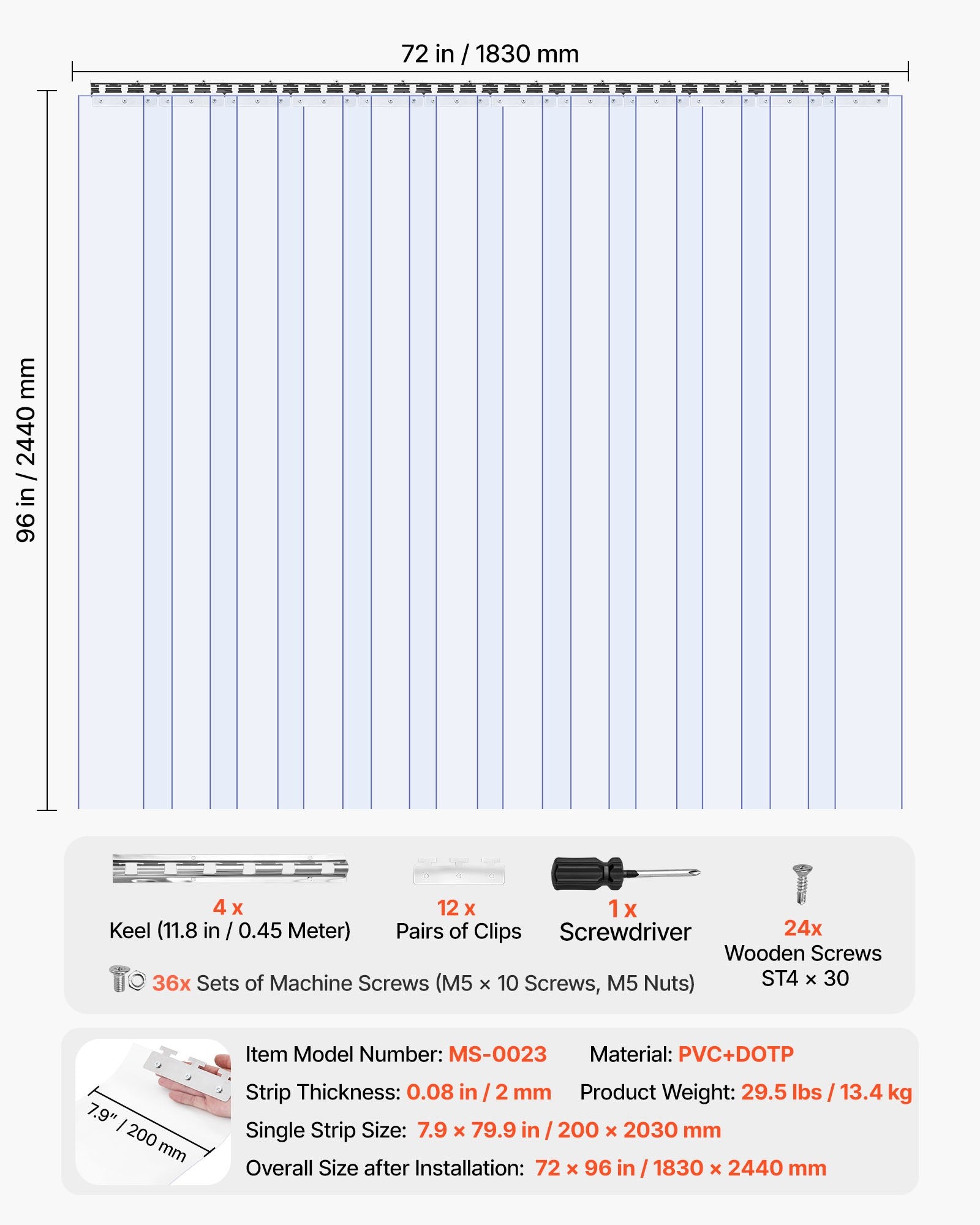 - Durable PVC Material: Say hello to our PVC strip curtain. It's soft, elastic, and crafted to last. There is no irritating smell here, and talk about easy to clean—your everyday dish soap will do the trick. Plus, it measures 72" x 96"/183 x 244 cm after Installation and is a hardy 0.08 in/2 mm thick.