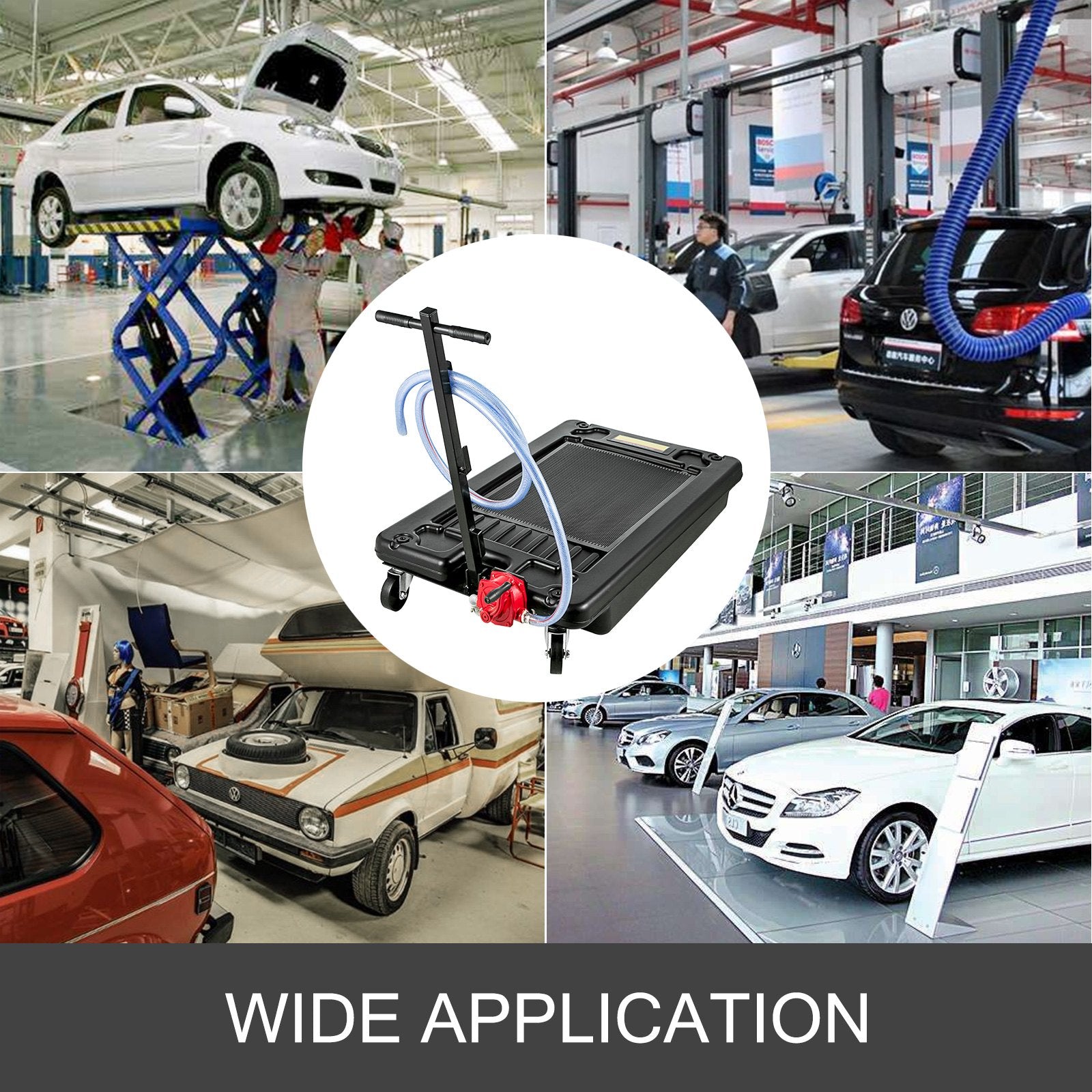 - 【WIDE APPLICATION】- This oil drain pan is ideal for draining oil or antifreeze where a pit or hoist is not available with a unique no-spill design. It also features with a 8ft hose so that the pan could be applied in multiple occasions.