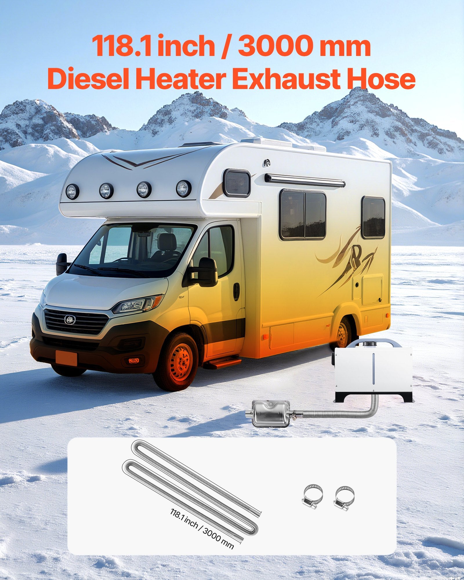- Exhaust Pipe Package: This diesel heater flexible exhaust pipe kit includes a 118.1 inch / 3000 mm exhaust pipe and 2 clamps, providing all components required for installation and maintenance. Designed for most diesel heaters, it ensures smooth exhaust flow and reliable performance