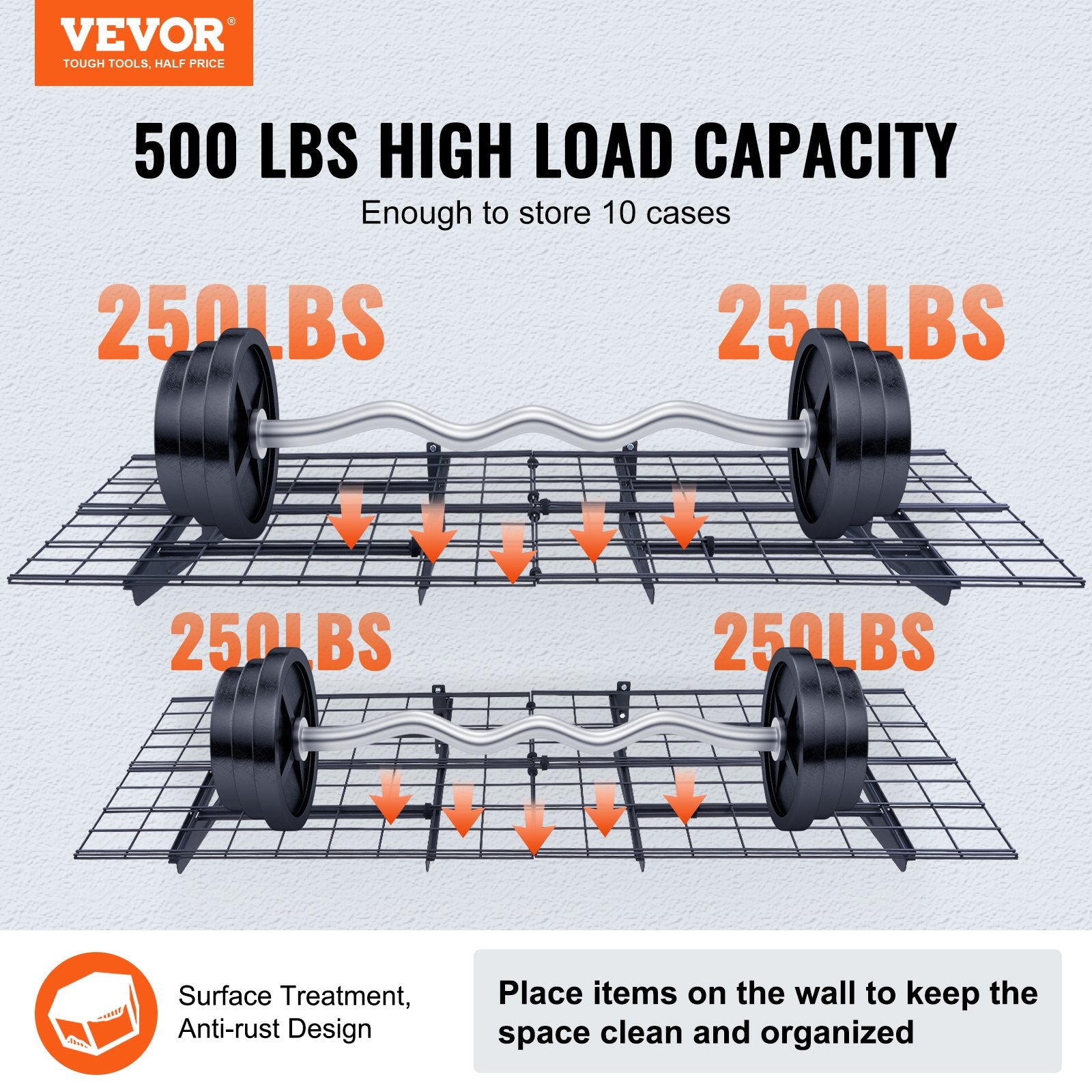 - 500 lbs High Load Capacity: Our garage wall shelving is made of high-quality metal, weighing 64.37 lbs. Each shelf has a maximum load capacity of 500 lbs, making it convenient for hanging tools. Installation Hole Spacing: 18 inches.