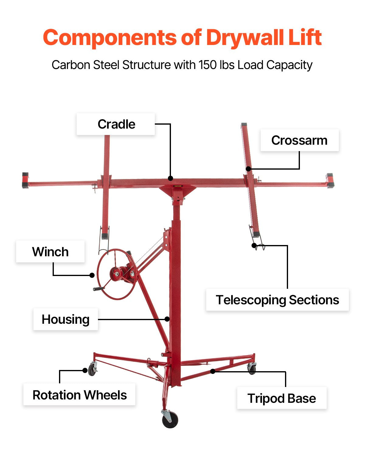 - Adjustable Height & Length: The telescopic arm can be adjusted from 4 to 9.5 ft, perfect for installing sheets. And the sheetrock lift drywall lift can reach a height of 16 ft that can help you attach to the ceiling.