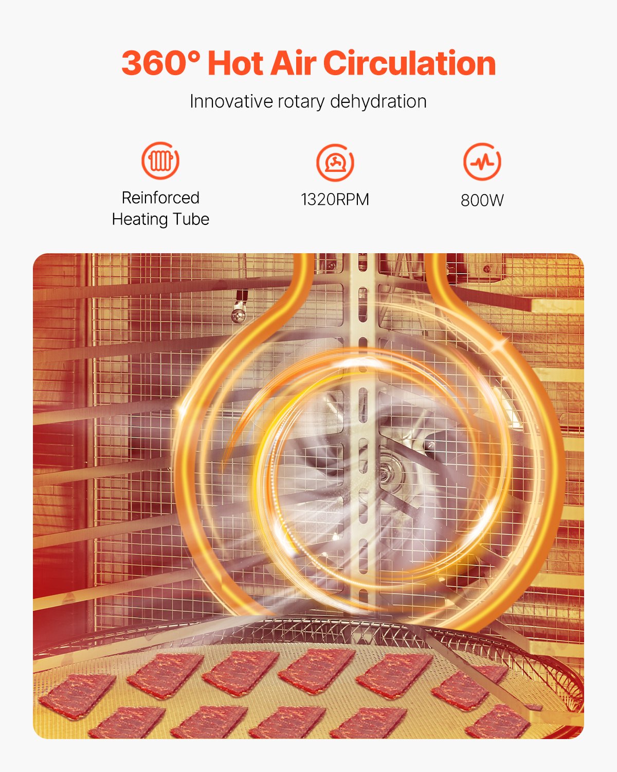 - Rotary Dehydration: The innovative rotary dehydration, a fan and a circulating airflow design ensure even heat and airflow distribution. This food dehydrator machine even dries various ingredients while preserving nutrients without loss