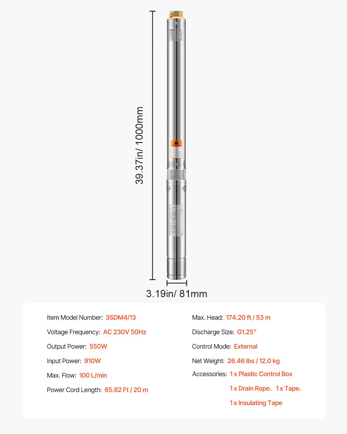 Deep Well Submersible Pump, 550W Output Power, 230V, 100 L/min Flow 53 m(174 ft) Head, with 20 m(65.62 ft) Cord External Control Box, Stainless Steel Water Pump, for Industrial Irrigation and Home Use, IP68
