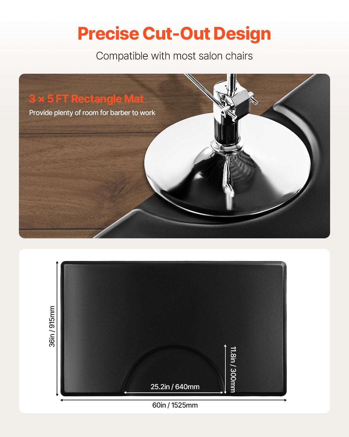 - Large Size: Our 1525 x 915 mm rectangle salon mat for hair stylists offers a spacious standing area, allowing barbers to move freely and work more efficiently. The 25.2" x 11.8" (640 x 300 mm) cut-out fits most salon chairs with a round base, staying securely in place without shifting