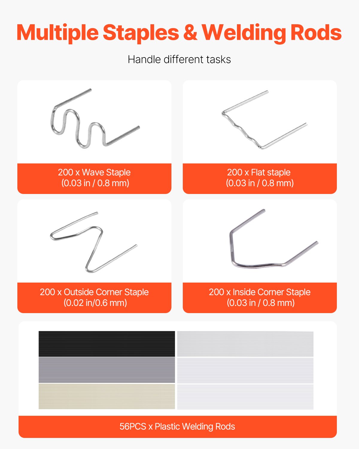 - Wide Applications: Designed specifically for cars, kayaks, plastic furniture, and toys, this hot staple welding gun includes 800PCS 6 types of hot staples and 56 welding rods of 7 different materials (ABS, PP, PE, TPE, PC, PUR, and PA) to meet various plastic welding needs.