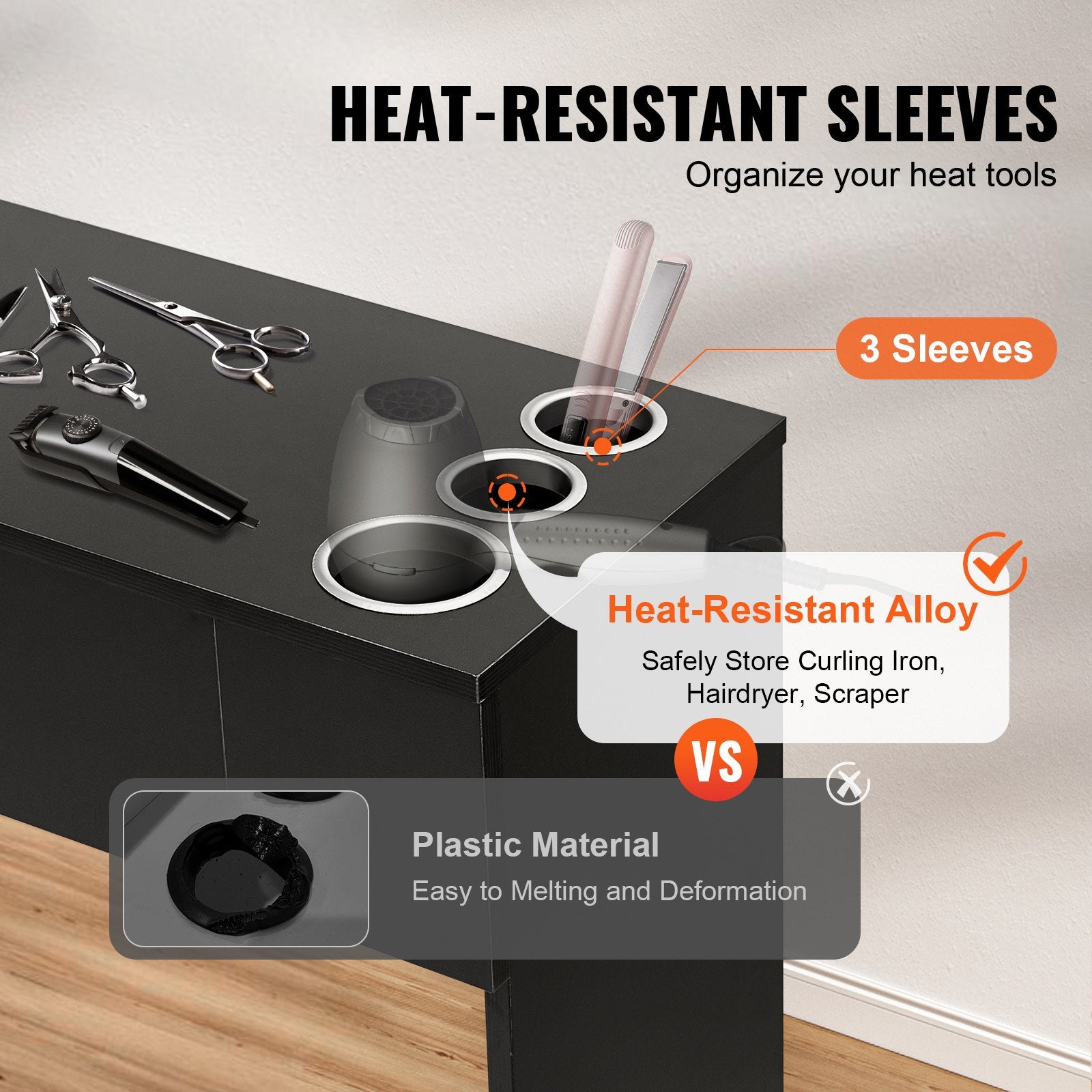 - Heat-Resistant Tool Sleeves: Made of heat-resistant alloy material, the hair styling salon station provides three heat tool sleeves with a bottom cover design to prevent tools from falling, ensuring safety during use.