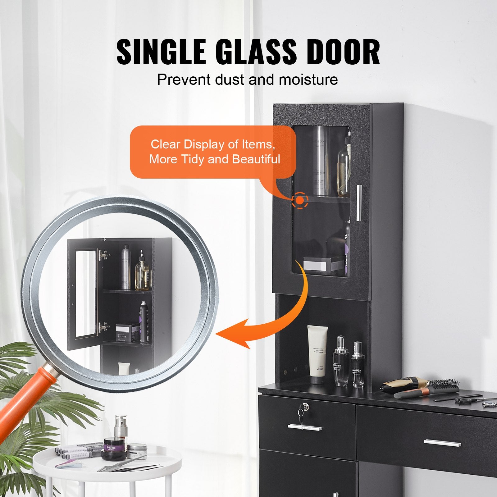 - Security & Privacy Protection: The glass cabinet door design prevents dust and get wet, maintaining cleanliness and enhancing overall aesthetics. Barber hair styling station is equipped with a lockable drawer for storing valuables securely.