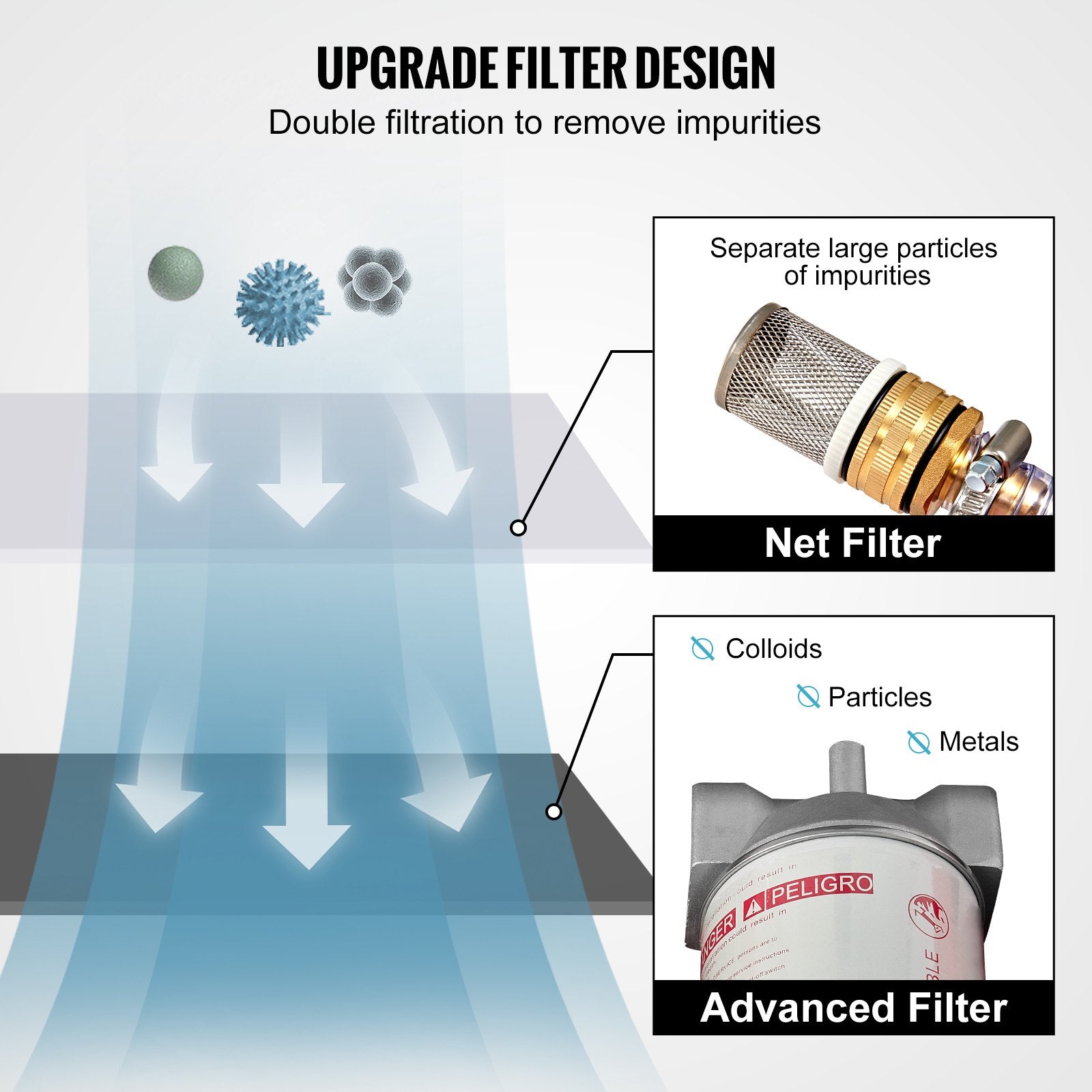 - Upgraded Filter Design: Compared with others products, Our fuel transfer tank is equipped with a duplex filter to offer purer diesel. The front-end filter of the inner tank can separate large particles of impurities, and the premium outer filter is designed to filtrate small impurities such as metal, colloids, tiny particles, etc.