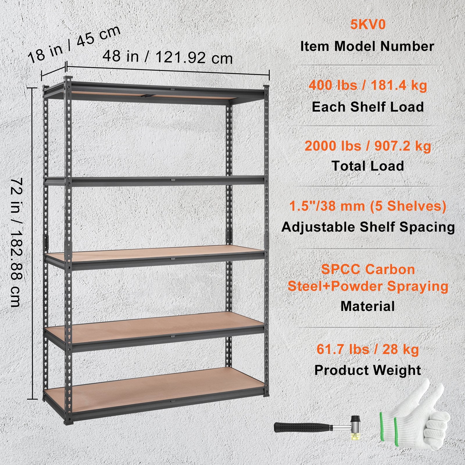 - Load Up Your Life: Transform your cluttered garage into a neat and organized space with our storage shelving unit. With a 2000 lbs total load capacity, you're free to pile on tools, supplies, or whatever you need in your garage or warehouse. Remember, each shelf is a sturdy 400 lbs carrying companion!