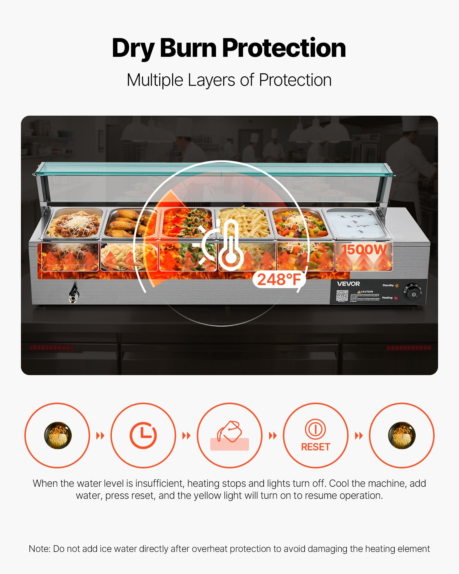 - Fast Even Heating: Equipped with a strong 1500W stainless steel heating tube, this commercial food warmer heats food quickly to keep flavors fresh. You can set the temperature from 86–185°F (30-85°C), adjusting to suit various dishes and serving needs