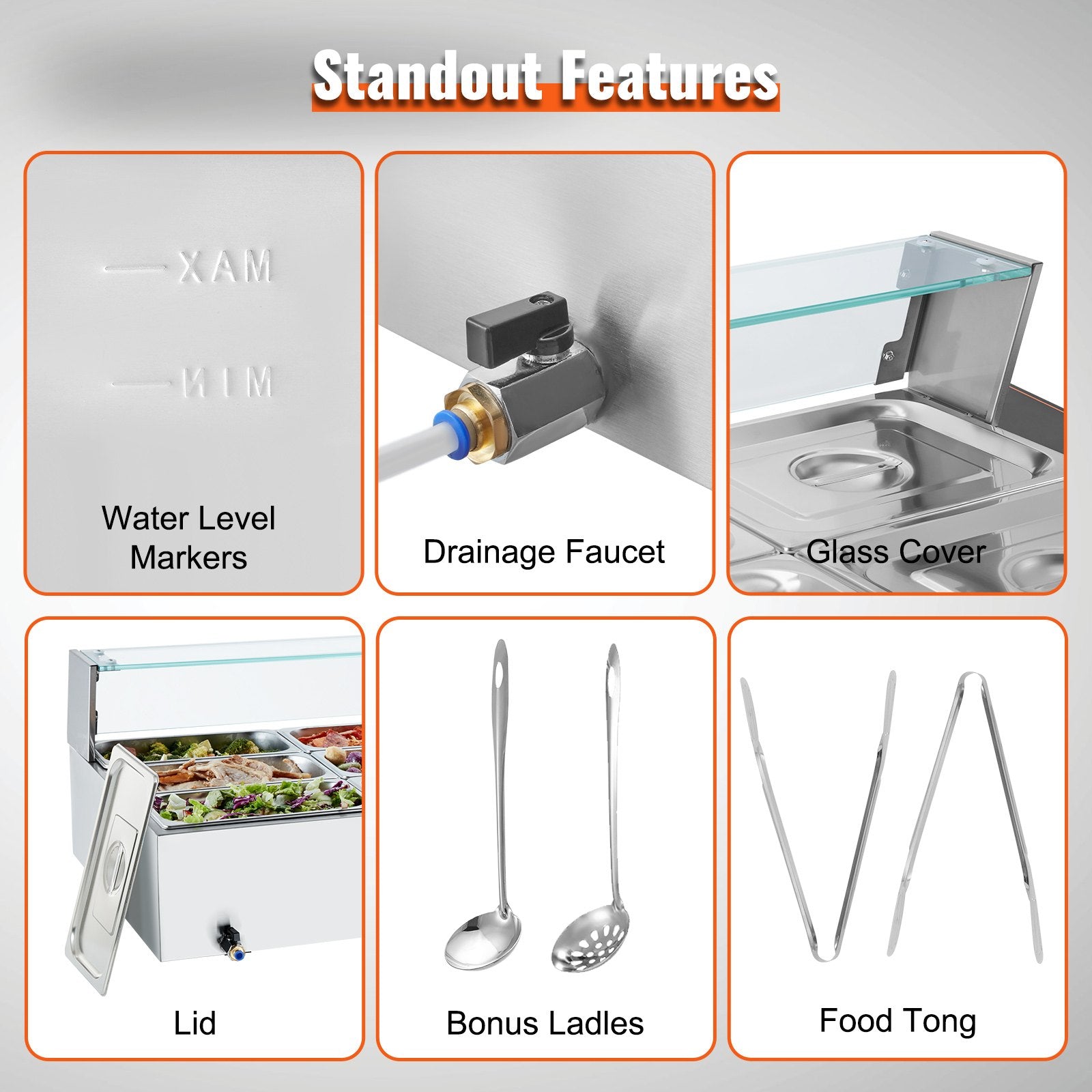 - Includes 12 Pans: Our commercial food warmer comes with twelve 5QT food pans (12*1/3-Size) accompanied by their respective lids, allowing you to serve different dishes simultaneously. Feel free to change up your menu from soups and sauces to stew, or even nacho cheese and chocolate.