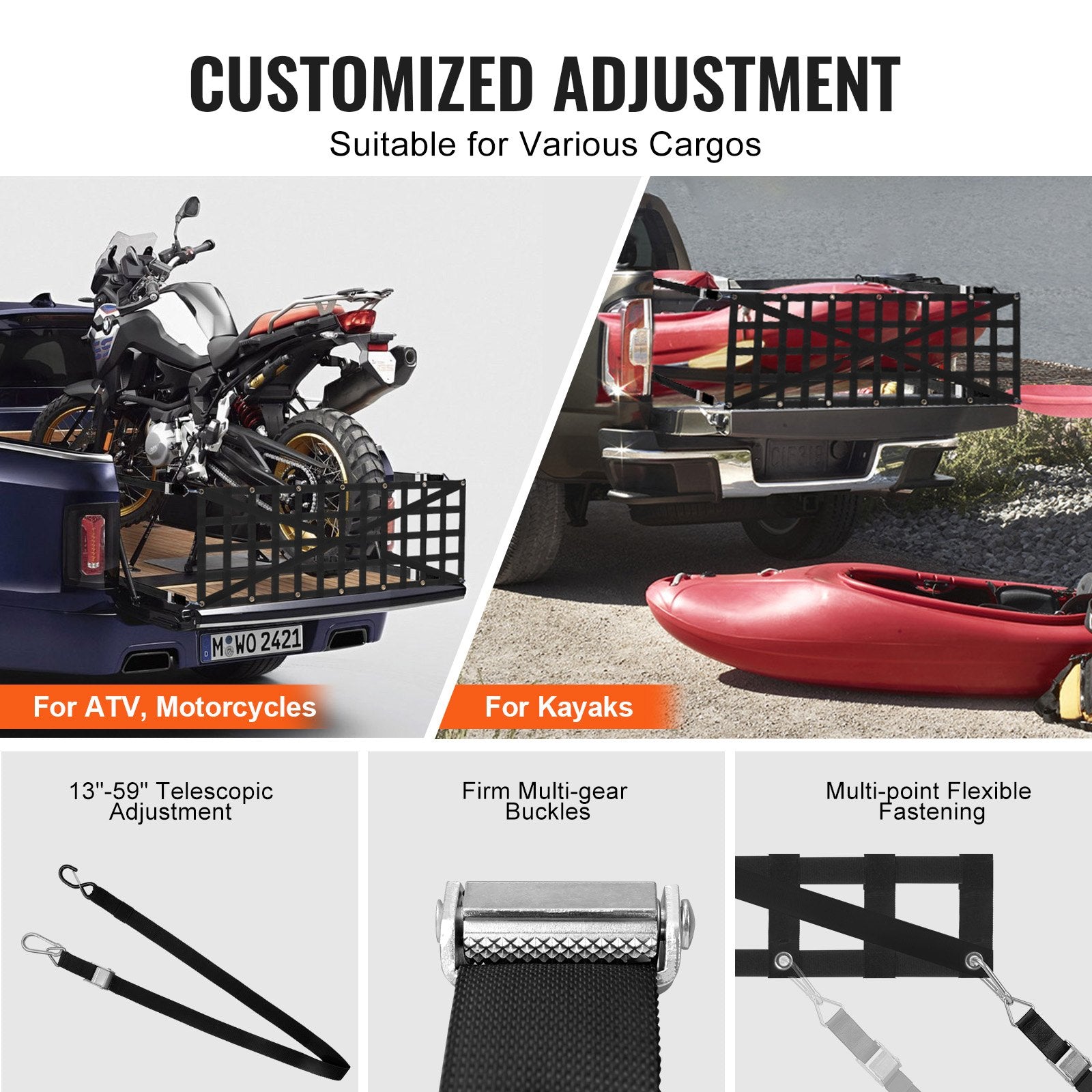 - Easy Installation & Disassembly: VEVOR tailgate net for pickup truck bed is equipped with metal buckles and S-hooks on each telescopic strap. You just need to fix the four S-hooks on the vehicle and there are no additional tools required, which saves time and improves efficiency. (Tip: Please make sure you have fixed the anchors or bolts on your truck.)