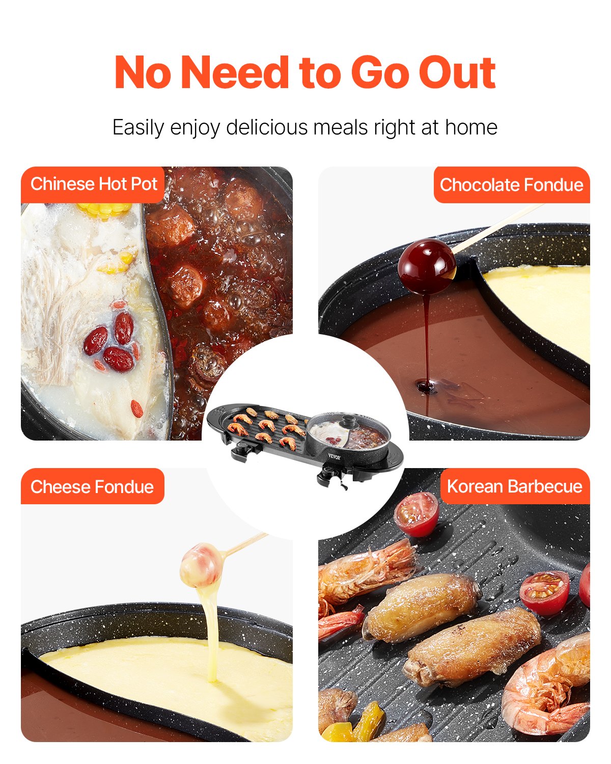 - Convenient Design: The oil leakage outlets on our hot pot grill can effectively discharge excess oil, and the oil box makes cleaning easier. Excellent for hot pot, cheese fondue, Japanese oden, or Korean barbecue at home