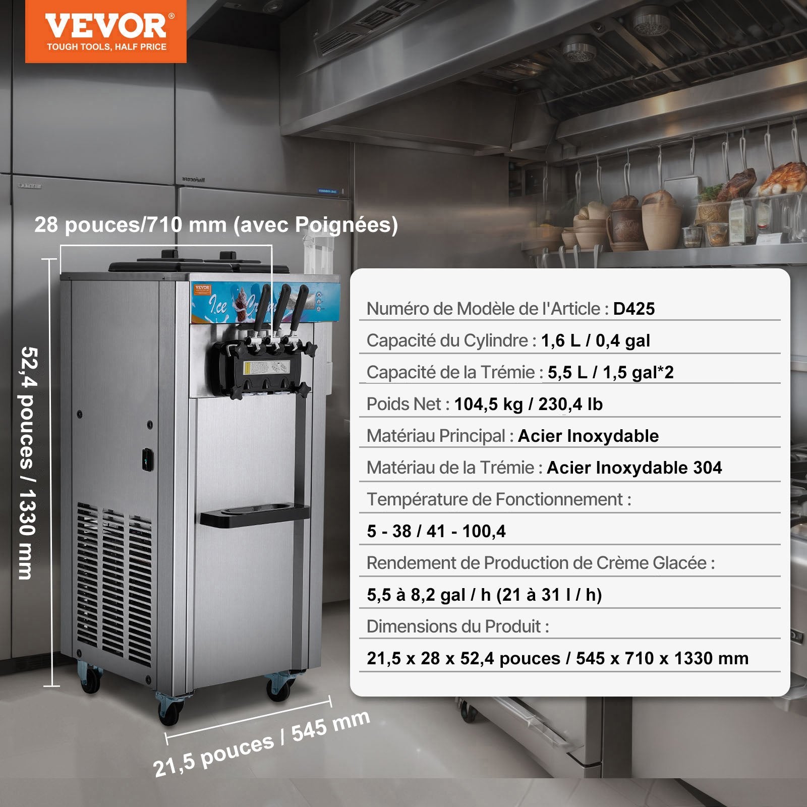 Commercial Ice Cream Machine, 21-31 L/H Yield, 1500W 3-Flavor Freestanding Soft Serve Ice Cream Maker, 2 x 5.5L Stainless Steel Cylinder, LED Panel Auto Clean Pre-cooling, for Restaurant Bars