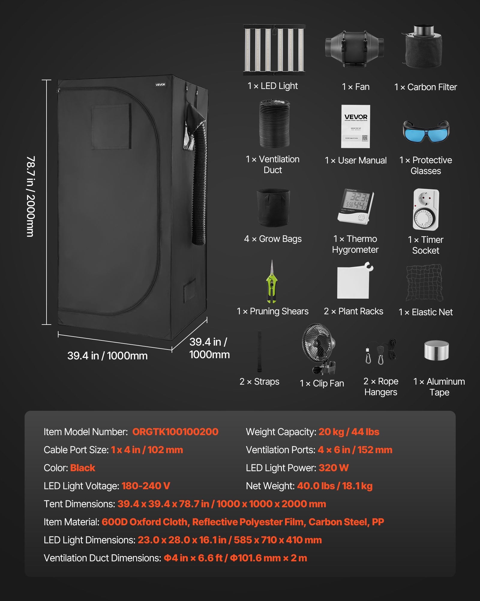 - Tent Dimensions: 1000 x 1000 x 2000 mm / 39.4 x 39.4 x 78.7 in