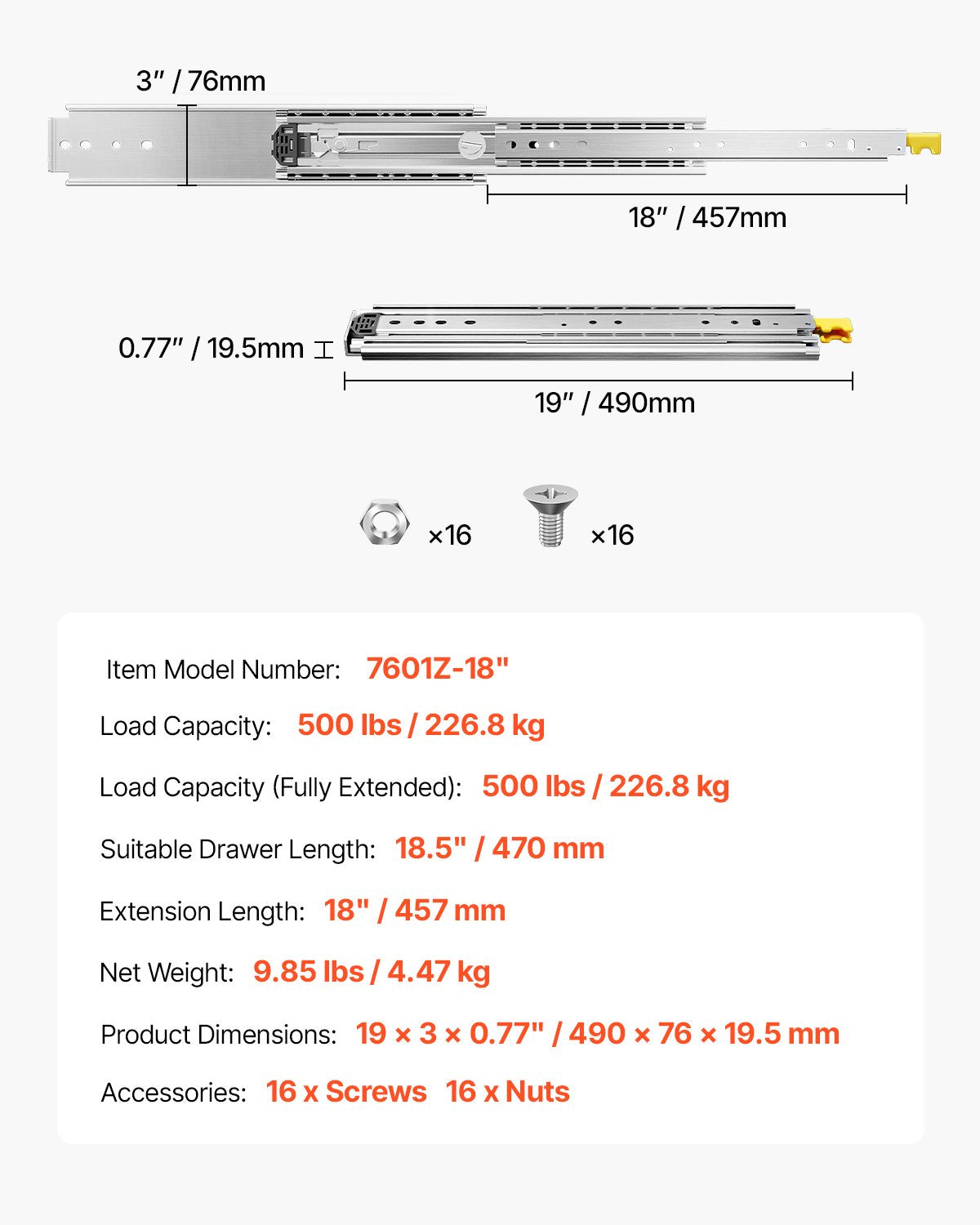 - 500lbs Heavy-Duty: Made of 0.77 in/19.5 mm thick high hardness steel, the heavy duty drawer slides have a weight capacity of up to 500 lbs. The galvanized finish makes the telescoping drawer slides rust and wear-resistant for long-time use. It can be used in shelving, cabinets, industrial drawers, RVs, trucks, vending machines and more.