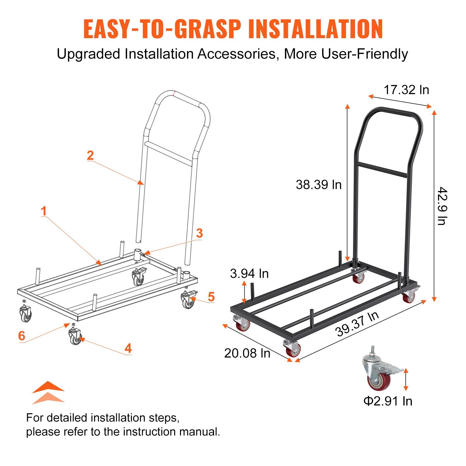 - Product Dimensions: Measuring 39.4 inches in length, 20 inches in width, and 42.9 inches in height, our folding chair dolly has a maximum weight capacity of 110lb. This allows for storage of up to 12 chairs, providing flexibility and space-saving convenience.