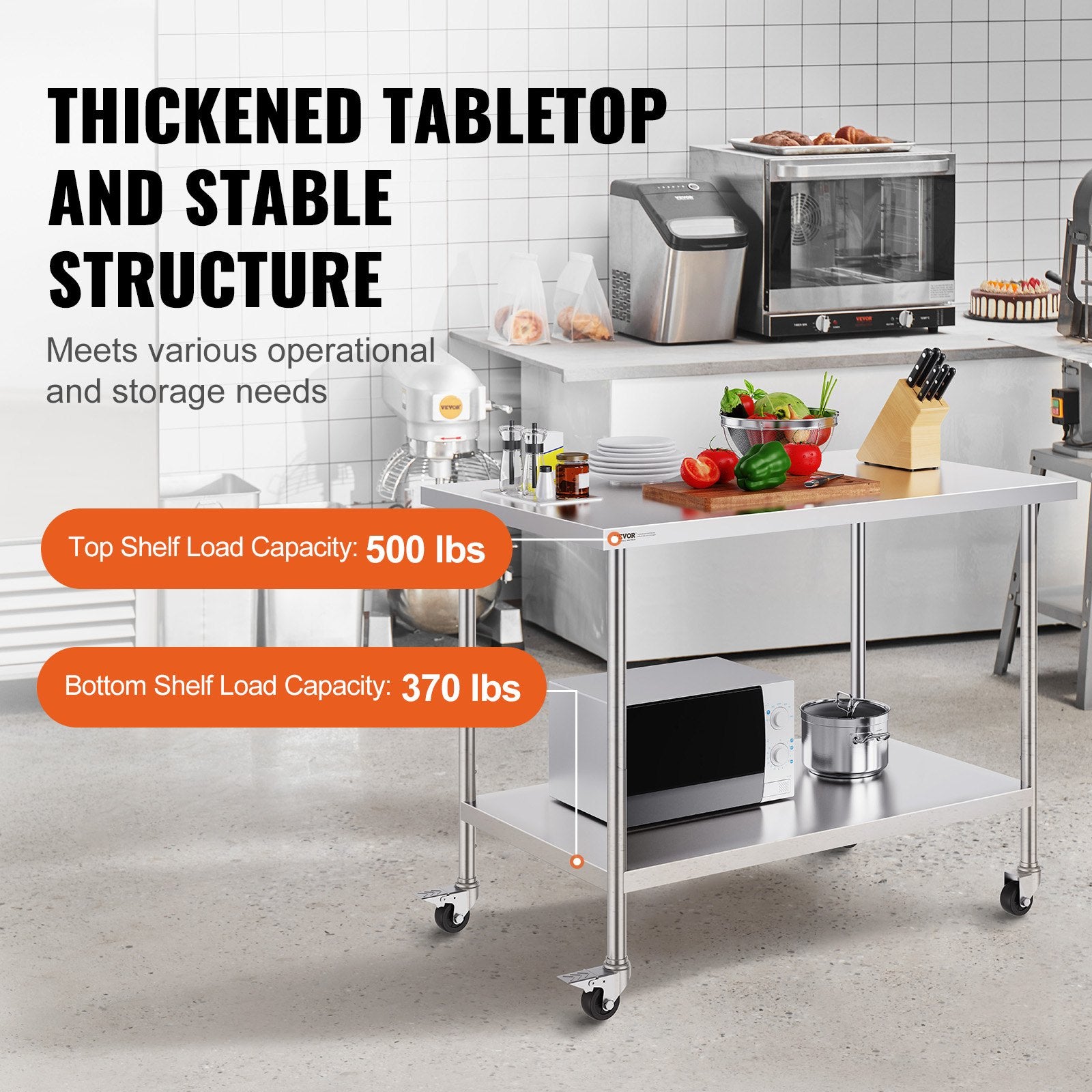 Arbetsbord i rostfritt stål 30 x 48 x 38 tum, med 4 hjul, 3 justerbara höjdnivåer, kraftigt arbetsbord för matlagning för storkök, restaurang, silver