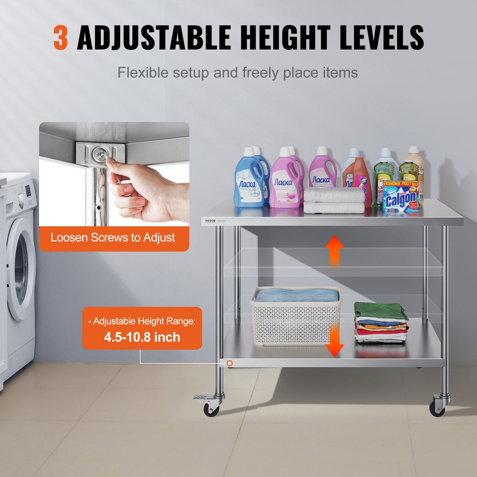 - Justerbar höjddesign: De justerbara hyllorna i 3 nivåer erbjuder de mest användarvänliga och praktiska funktionerna. Justera enkelt hyllhöjden med skruvar för att passa föremål i olika storlekar.